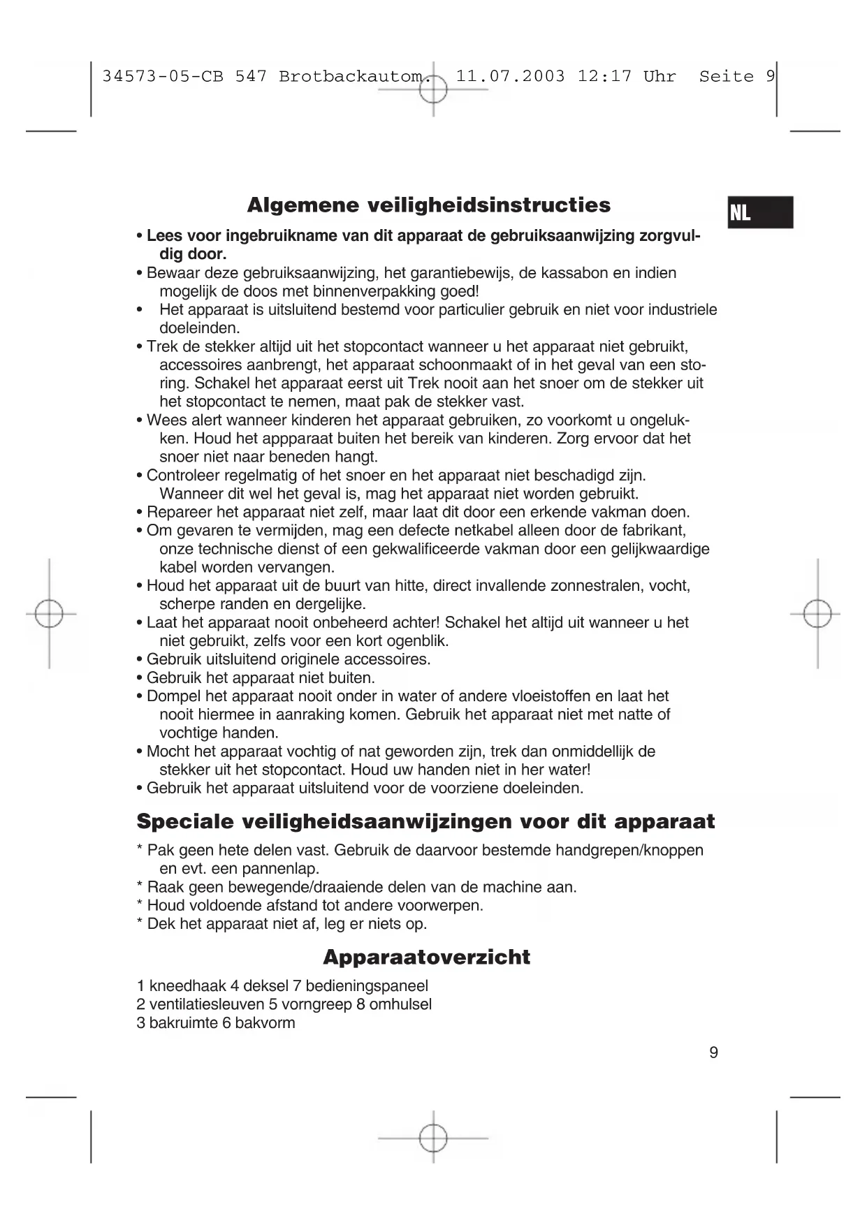 34573-05-CB 547 Brotbackautom. 11.07.2003 12:17 Uhr Seite 9Inbedrijfstelling van het apparaat Reinig de bakvorm en de toebehoren op gebruikelijke wijze in afwaswater. Geen spitse voorwerpen gebruiken en niet schuren! De vorm heeft een anti-aanbaklaag. Vet nu de bakvorm in en bak deze ca. 10 minuten zonder inhoud. A.u.b. nog een keer reinigen. Plaats de kneedhaak op de as in de bakruimte. Elektrische aansluiting Sluit het apparaat alleen aan op een volgens de voorschriften geïnstalleerd 230 V, 50 Hz geaard stopcontact. U hoort een pieptoon. Na korte tijd verschijnt "3:00" op het display, waarbij de dub- bele punt tussen "3" en "00" niet knippert, maar constant brandt. Het apparaat is nu gereed voor gebruik en staat eerst automatisch op programma "1" (normale stand) maar is nog niet gestart. Functies & bediening SELECTIE Met deze toets selecteert u het bakprogramma. Na iedere keer indrukken (gepaard gaand met een korte pieptoon) verandert het ingestelde programma. Het huidige programma wordt op het display weergegeven BRUININGSGRAAD Met deze toets selecteert u een lichte, matige of donkere kleur van de korst. START/STOP-toets: Deze start resp. Stopt/beëindigt het qeselecteerde bakprogramma. START: Om een programma te starten. drukt u ca. 1 seconde lang op de "START/STOP"-toets. Een korte pieptoon klinkt en de dubbele punt in de tijdsaan- duiding begint te knipperen. Het programma loopt nu. STOP: Om een lopend programma te beëindigen, drukt u gedurende ca. 3 secon- den op de "START/STOP"-toets tot een pieptoon het uitschakelen van het program- ma bevestigt. Aan/uit Knipperende dubbele punt: programma is ingeschakeld Continu brandende dubbele punt: programma is uitgeschakeld Tijdvertraging Met de ingestelde tijd kunt u 9de duur vastleggen tot het tijdstip waarop uw brood klaar moet zijn. Van tevoren moeten bakwijze en bruiningygraad ingesteld worden.
