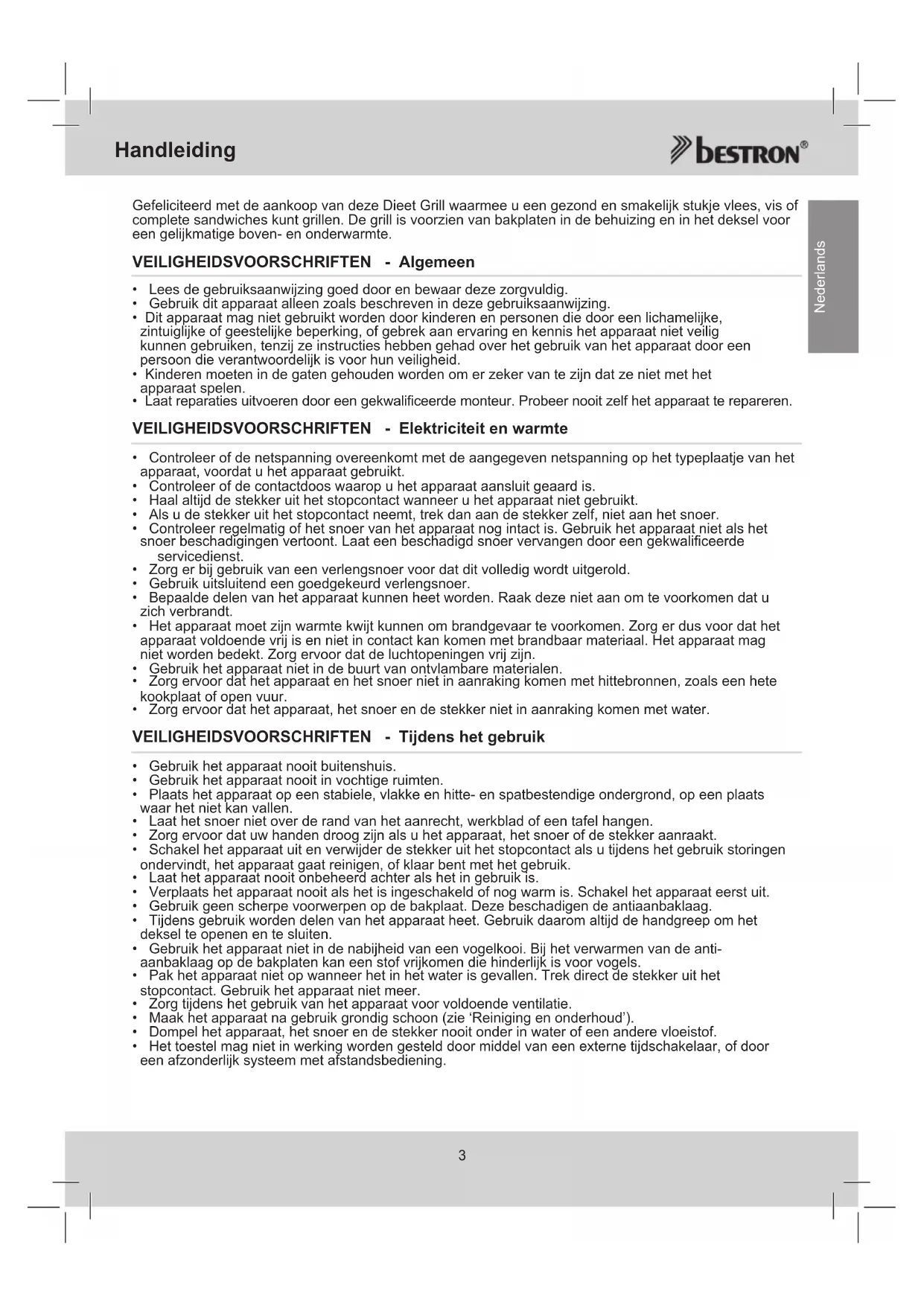 Nederlands Gefeliciteerd met de aankoop van deze Dieet Grill waarmee u een gezond en smakelijk stukje vlees, vis of complete sandwiches kunt grillen. De grill is voorzien van bakplaten in de behuizing en in het deksel voor een gelijkmatige boven- en onderwarmte. VEILIGHEIDSVOORSCHRIFTEN - Algemeen