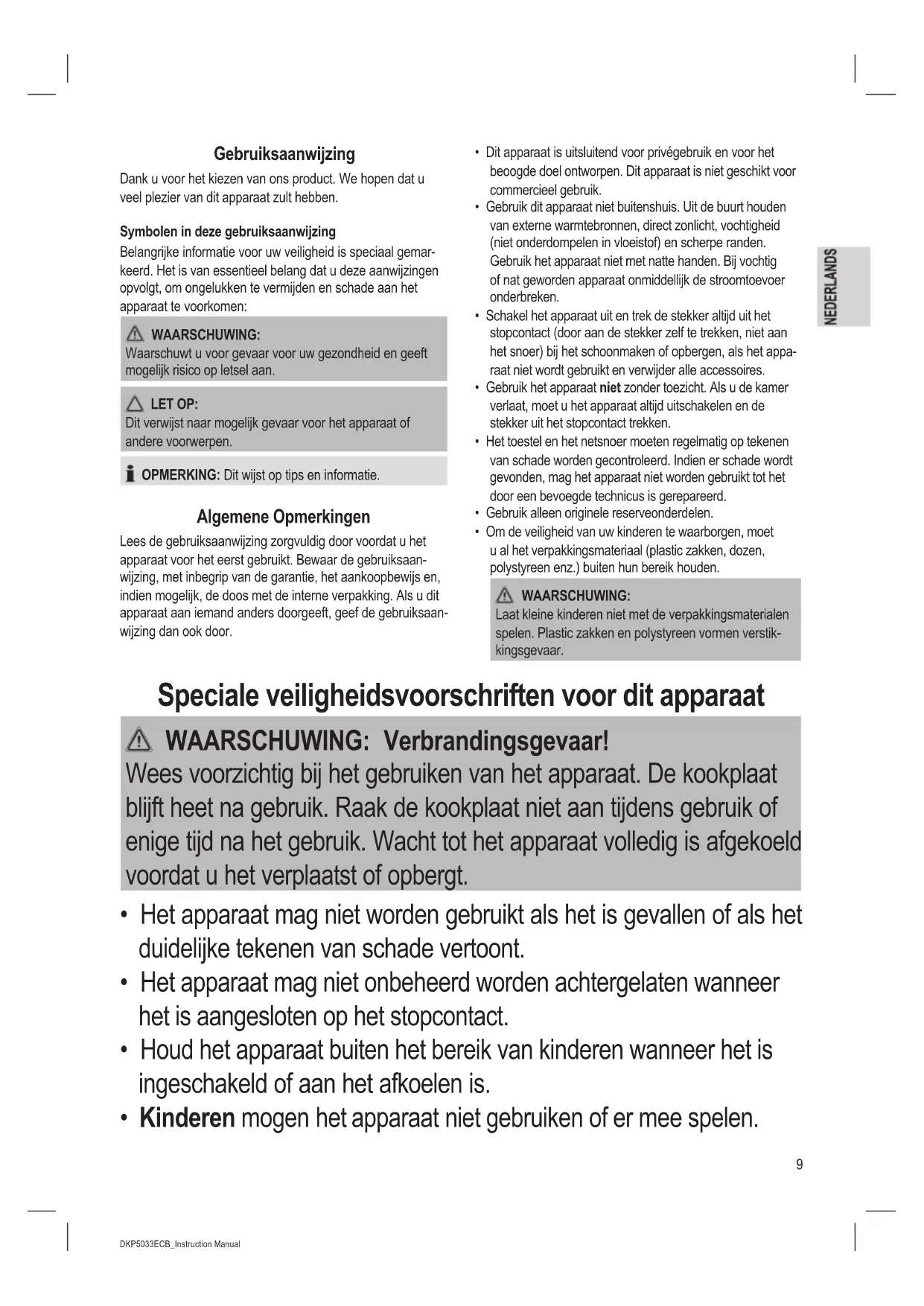 - Om de veiligheid van uw kinderen te waarborgen, moet u al het verpakkingsmateriaal (plastic zakken, dozen, polystyreen enz.) buiten hun bereik houden. WAARSCHUWING: Laat kleine kinderen niet met de verpakkingsmaterialen spelen. Plastic zakken en polystyreen vormen verstik- kingsgevaar. Speciale veiligheidsvoorschriften voor dit apparaat WAARSCHUWING: Verbrandingsgevaar! Wees voorzichtig bij het gebruiken van het apparaat. De kookplaat blijft heet na gebruik. Raak de kookplaat niet aan tijdens gebruik of enige tijd na het gebruik. Wacht tot het apparaat volledig is afgekoeld voordat u het verplaatst of opbergt.