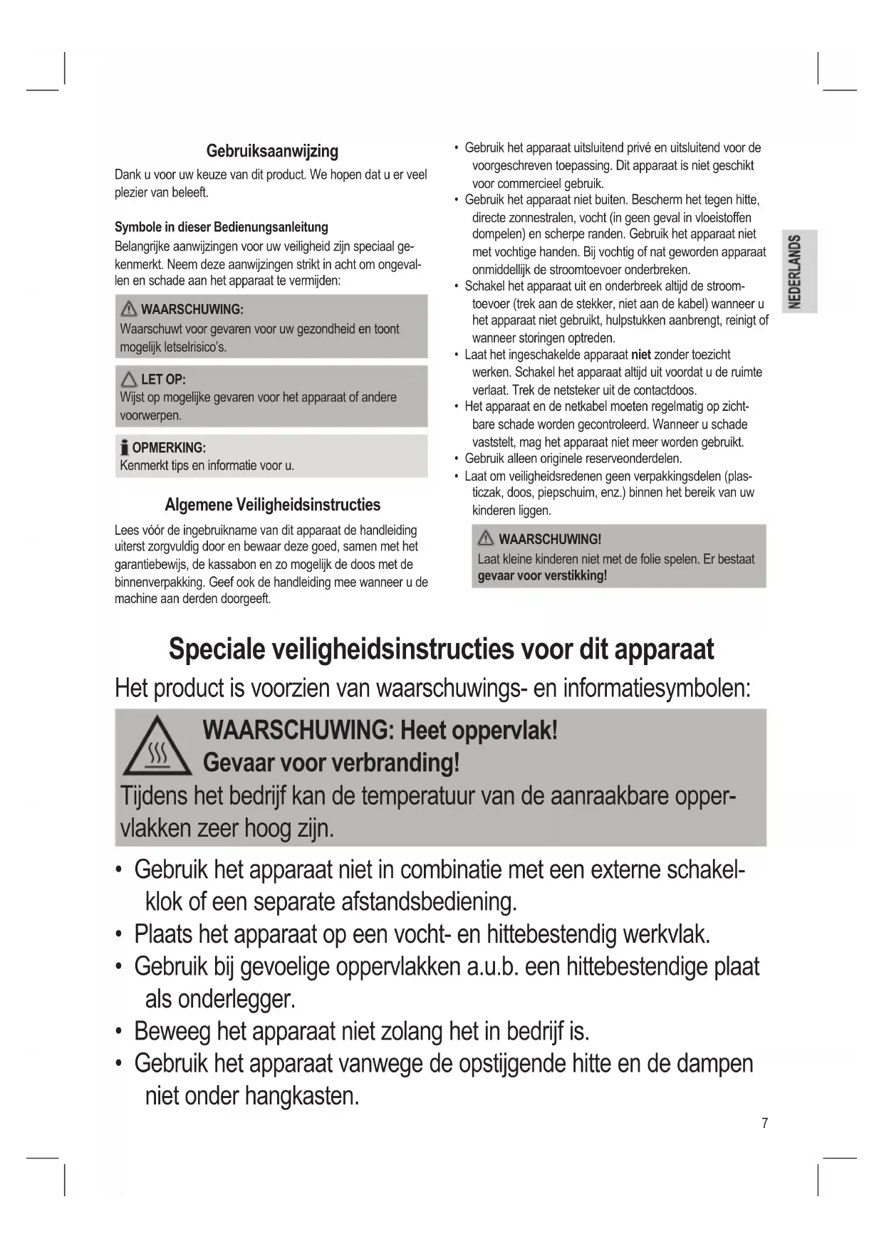 - Laat om veiligheidsredenen geen verpakkingsdelen (plas- ticzak, doos, piepschuim, enz.) binnen het bereik van uw kinderen liggen. WAARSCHUWING! Laat kleine kinderen niet met de folie spelen. Er bestaat gevaar voor verstikking! Speciale veiligheidsinstructies voor dit apparaat Het product is voorzien van waarschuwings- en informatiesymbolen: WAARSCHUWING: Heet oppervlak! Gevaar voor verbranding! Tijdens het bedrijf kan de temperatuur van de aanraakbare opper- vlakken zeer hoog zijn.