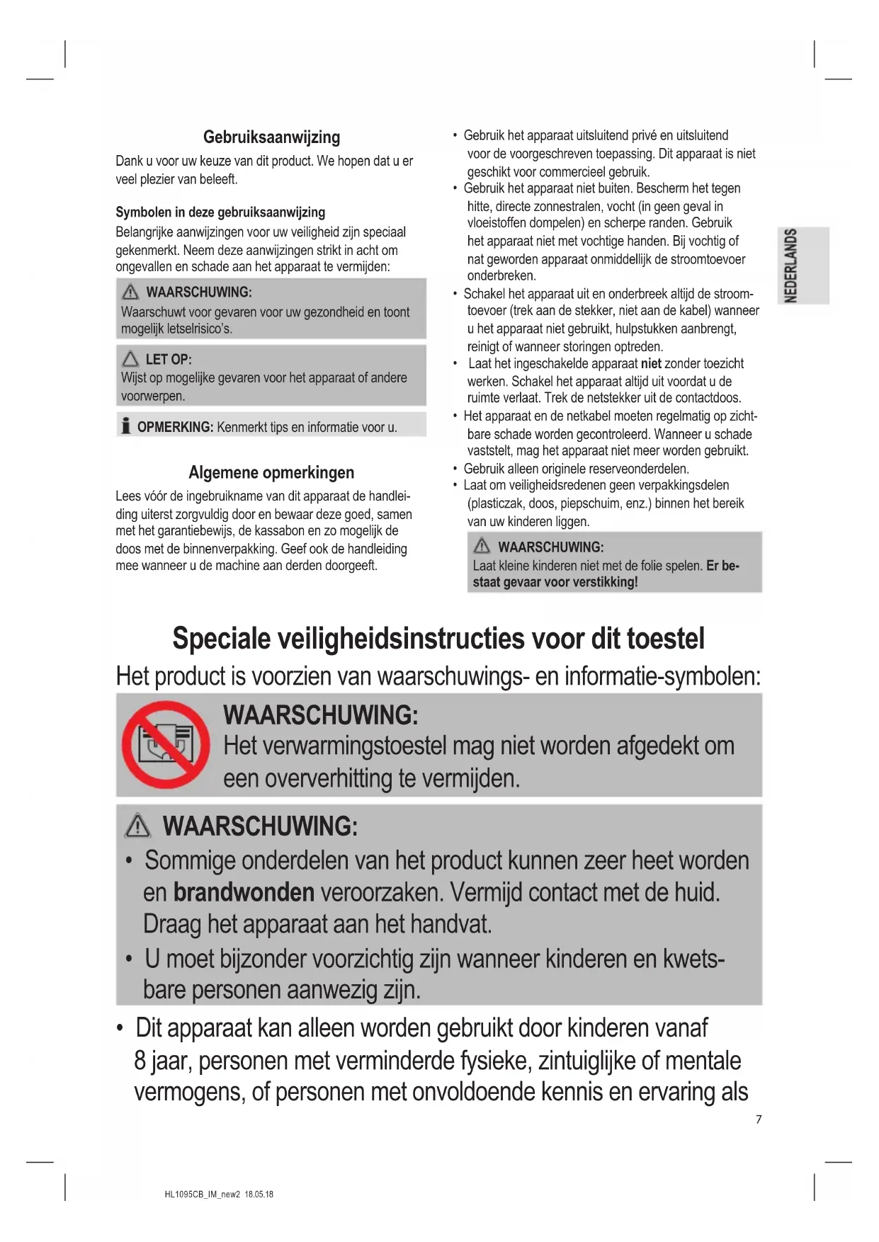 - Dit apparaat kan alleen worden gebruikt door kinderen vanaf 8 jaar, personen met verminderde fysieke, zintuiglijke of mentale vermogens, of personen met onvoldoende kennis en ervaring alsHL1095CB_IM_new2 18.05.18