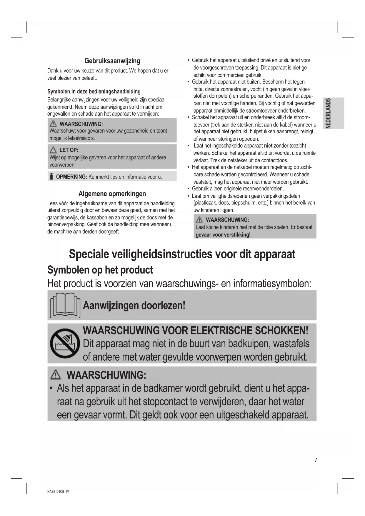 - Laat om veiligheidsredenen geen verpakkingsdelen (plasticzak, doos, piepschuim, enz.) binnen het bereik van uw kinderen liggen. WAARSCHUWING: Laat kleine kinderen niet met de folie spelen. Er bestaat gevaar voor verstikking! Speciale veiligheidsinstructies voor dit apparaat Symbolen op het product Het product is voorzien van waarschuwings- en informatiesymbolen: Aanwijzingen doorlezen! WAARSCHUWING VOOR ELEKTRISCHE SCHOKKEN! Dit apparaat mag niet in de buurt van badkuipen, wastafels of andere met water gevulde voorwerpen worden gebruikt. WAARSCHUWING: