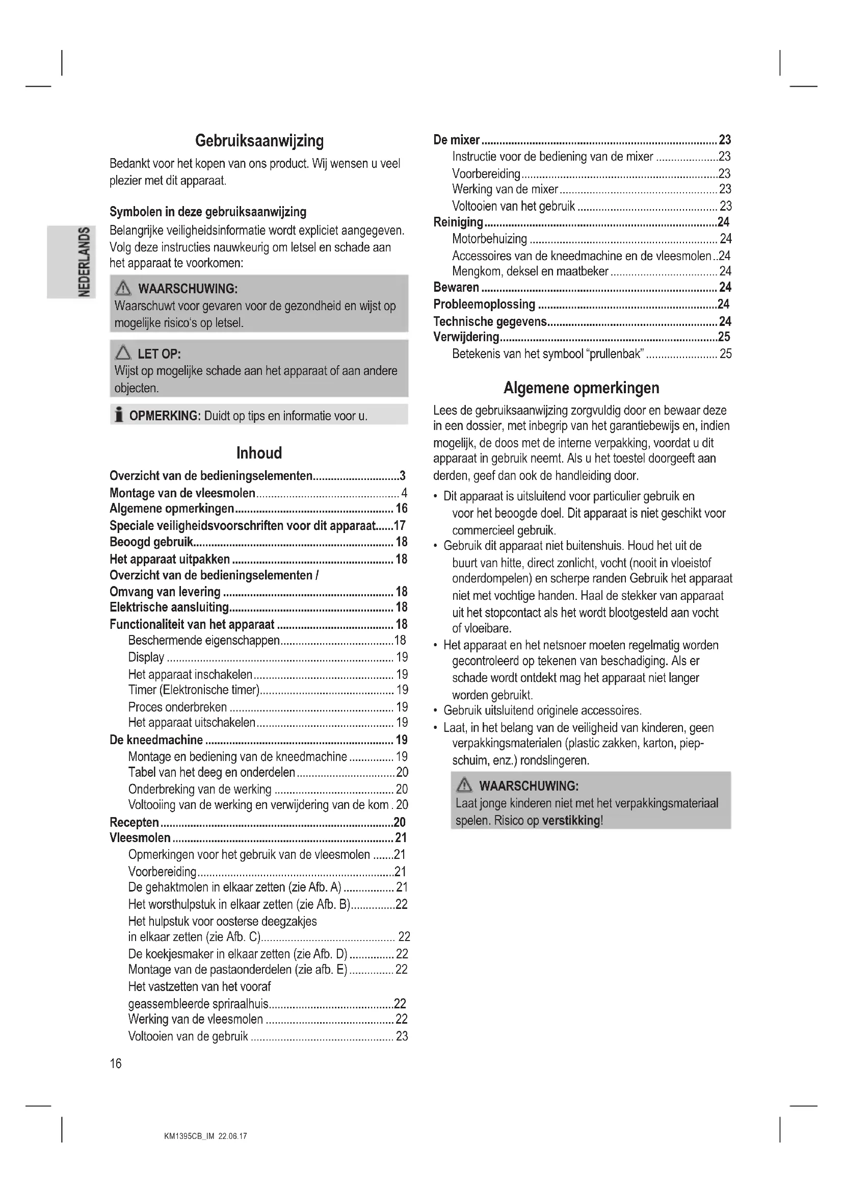 beschadigingen worden gevonden, neem het apparaat dan niet in gebruik. Breng het onmiddellijk terug naar de leverancier. OPMERKING: Er is mogelijk wat stof of productieresten op het apparaat te vinden. We raden u aan om het apparaat te reinigen, zoals beschreven onder “Reiniging”. Overzicht van de bedieningselementen / Omvang van levering Pagina 3 1 Dop van het deksel (maatbeker) 2 Uitsparing op deksel voor grip 3 Deksel 4 Ontgrendelknop 5 Mengkom 6 Beschermkap voor de mixermotor 7 Zwenkarm 8 Display 9 Bedieningstoetsen 10 Handel om de arm omhoog / omlaag te bewegen 11 Draaiknop 12 Motorbehuizing 13 Mengkom 14 Spatscherm 15 Beschermkap voor de motor van de vleesmolen 16 Vleesmolen met de vullade en stamper 17 Klopper 18 Roerhaak 19 Deeghaak 20 Beschermkap Pagina 4: Montage van de vleesmolen 21 Aandrukker 22 Trechterbakje 23 Trechterhals van spiraalhuis 24 Spiraal 25 Siliconenkoppeling 26 Mes 27 3 zeven (jn, medium, grof) 28 Vergrendelingsring 29 Deegverdeler 30 Worstmaker 31 2-delig “Kebbe” hulpstuk 32 Koekjesmaker 33 Koekjesvormsnijder 34 4 pastaonderdelen (verschillende pastavormen) Elektrische aansluiting Controleer of de netspanning die u wilt gebruiken overeen- komt met die van het apparaat. De informatie is vindbaar op het naamplaatje. Functionaliteit van het apparaat Beschermende eigenschappen