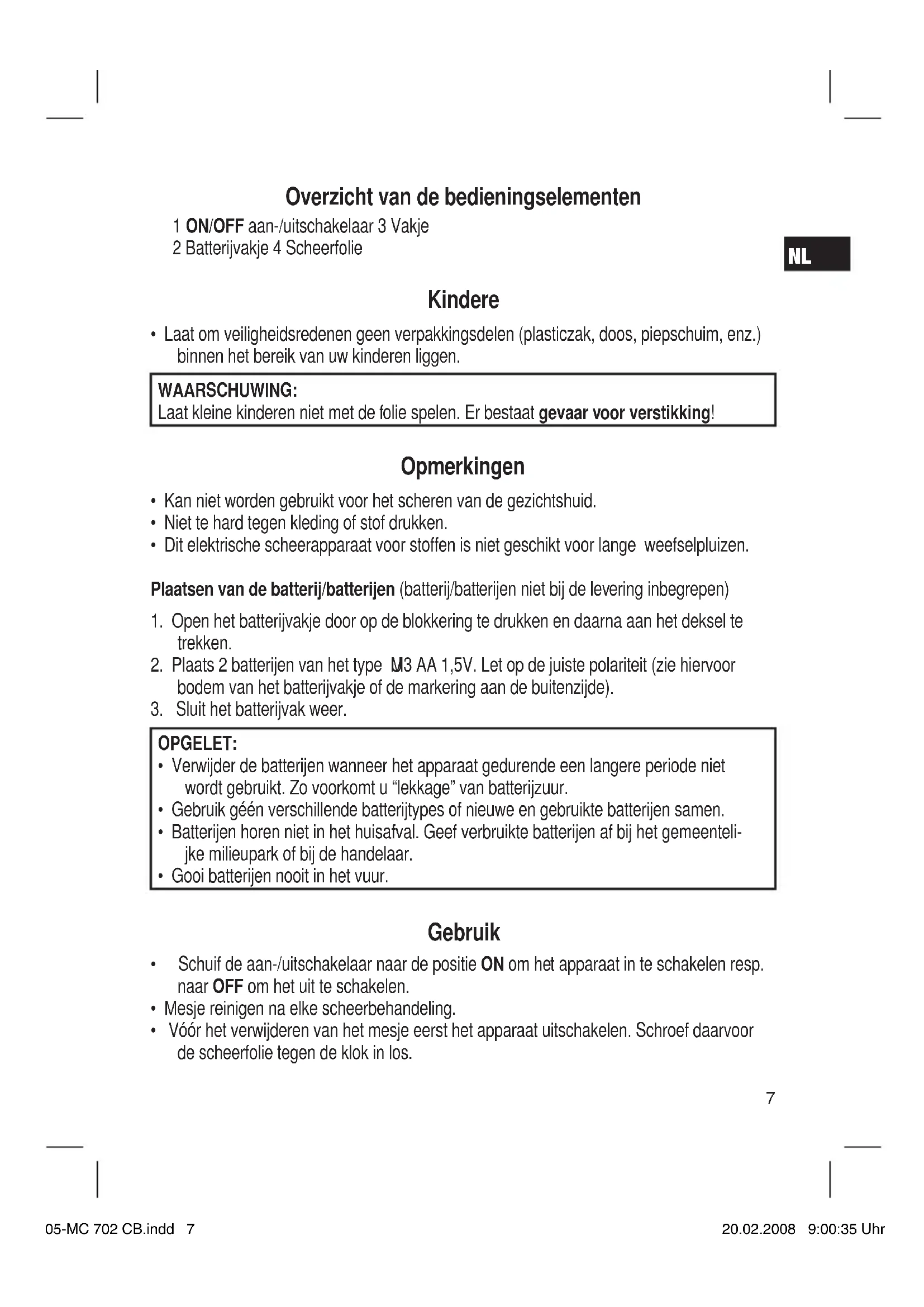 - Trek het vakje (3) naar achteren weg wanneer u daar pluizen wilt verwijderen. Garantie Voor het door ons geleverde apparaat verlenen wij een garantie van 24 maanden vanaf koopdatum (kassabon). Eventuele gebreken aan het apparaat of aan het toebehoren die zijn ontstaan door productie- of materiaalfouten verhelpen wij binnen deze periode kosteloos door middel van reparatie of, naar ons oordeel, door vervanging. Eventuele garantiegevallen verlengen noch de geldigheidsduur van de garantie, noch begint daardoor een nieuwe garantieperiode! Het koopbewijs geldt als garantiebewijs. Zonder dit bewijs kan geen kosteloze reparatie of vervanging plaatsvinden. Geef in garantiegevallen het complete apparaat in de originele verpakking samen met de kassabon af bij uw handelaar. Niet alleen defecten aan de hulpstukken of aan de slijtende onderdelen, maar ook reiniging, onderhoud of de vervanging van slijtende delen vallen niet onder de garantie en geschieden altijd tegen berekening! Bij ingrepen door derden komt de garantieverlening te vervallen. Na de garantieperiode Na afl oop van de garantieperiode kunnen reparaties tegen berekening worden uitgevoerd door de betreffende vakhandelaar of de technische dienst. Betekenis van het symbool ‘vuilnisemmer’ Bescherm ons milieu, elektrische apparaten horen niet in het huisafval. Maak voor het afvoeren van elektrische apparaten gebruik van de voorgeschreven verza- melpunten en geef daar de elektrische apparaten af die u niet meer gebruikt. Daardoor helpt u de potentiële effecten te voorkomen die een verkeerde afvoer op het milieu en de menselijke gezondheid kunnen hebben. 05-MC 702 CB.indd 805-MC 702 CB.indd 8 20.02.2008 9:00:35 Uhr20.02.2008 9:00:35 UhrNL