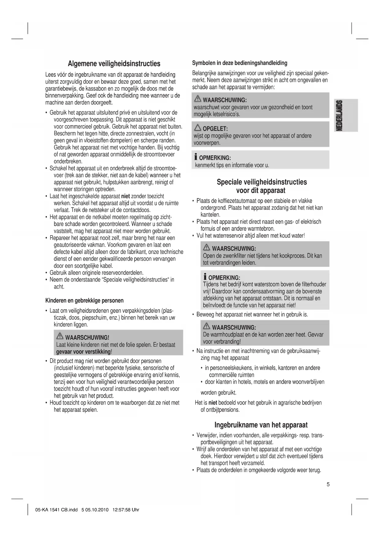 - Plaats de onderdelen in omgekeerde volgorde weer terug. 05-KA 1541 CB.indd 5 05.10.2010 12:57:58 Uhr6 NEDERLANDS oPMERKING: Laat vóór het eerste zetten van kofe 2-3 keer water voor de reiniging door het apparaat lopen. Elektrische aansluiting oPMERKING: Let op dat het apparaat uitgeschakeld is. De schakelaar moet op “0” staan. Steek de netsteker in een correct geïnstalleerde en geaarde contactdoos 230 V, 50 Hz. De gegevens hierover vindt u op het typeplaatje van het apparaat. Gebruik