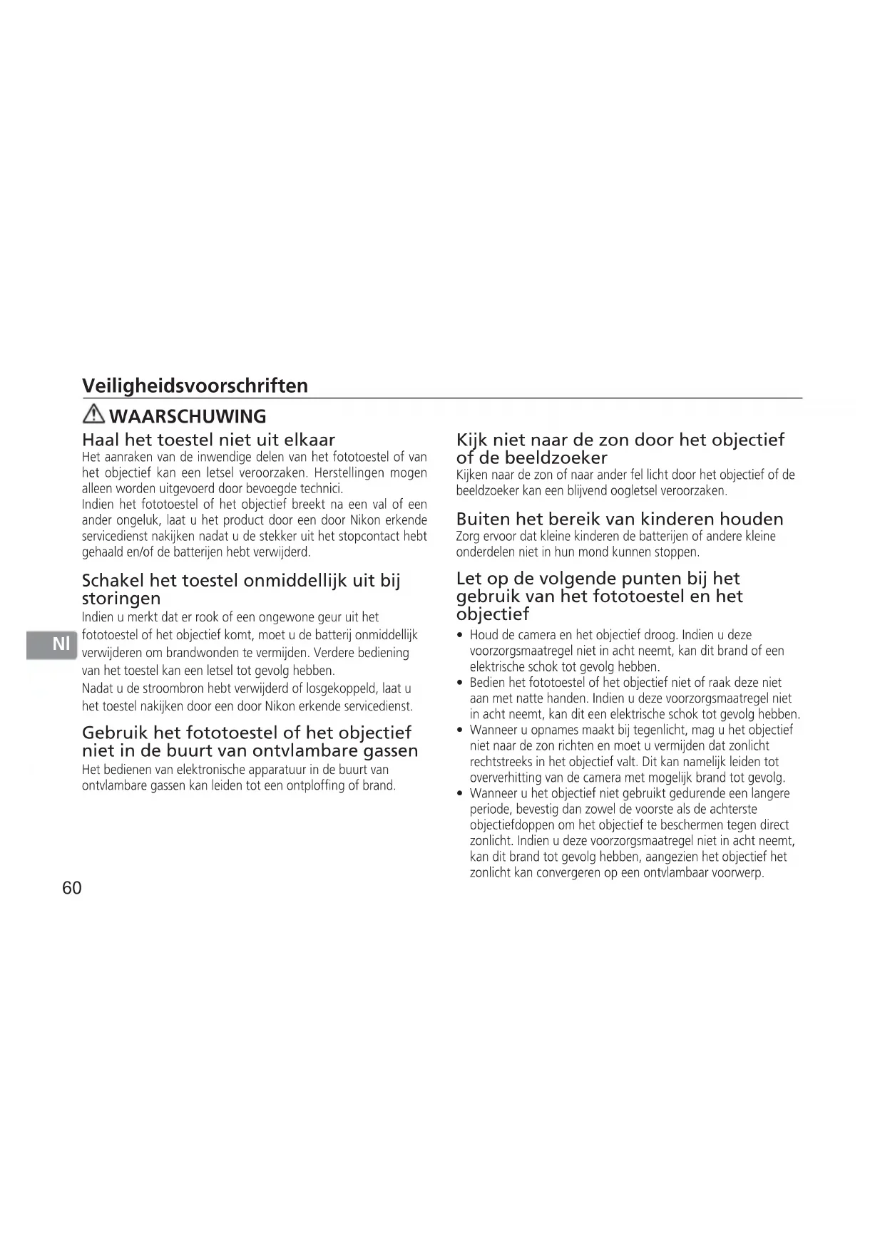 Veiligheidsvoorschriften WAARSCHUWING Haal het toestel niet uit elkaar Het aanraken van de inwendige delen van het fototoestel of van het objectief kan een letsel veroorzaken. Herstellingen mogen alleen worden uitgevoerd door bevoegde technici. Indien het fototoestel of het objectief breekt na een val of een ander ongeluk, laat u het product door een door Nikon erkende servicedienst nakijken nadat u de stekker uit het stopcontact hebt gehaald en/of de batterijen hebt verwijderd. Schakel het toestel onmiddellijk uit bij storingen Indien u merkt dat er rook of een ongewone geur uit het fototoestel of het objectief komt, moet u de batterij onmiddellijk verwijderen om brandwonden te vermijden. Verdere bediening van het toestel kan een letsel tot gevolg hebben. Nadat u de stroombron hebt verwijderd of losgekoppeld, laat u het toestel nakijken door een door Nikon erkende servicedienst. Gebruik het fototoestel of het objectief niet in de buurt van ontvlambare gassen Het bedienen van elektronische apparatuur in de buurt van ontvlambare gassen kan leiden tot een ontploffing of brand. Kijk niet naar de zon door het objectief of de beeldzoeker Kijken naar de zon of naar ander fel licht door het objectief of de beeldzoeker kan een blijvend oogletsel veroorzaken. Buiten het bereik van kinderen houden Zorg ervoor dat kleine kinderen de batterijen of andere kleine onderdelen niet in hun mond kunnen stoppen. Let op de volgende punten bij het gebruik van het fototoestel en het objectief