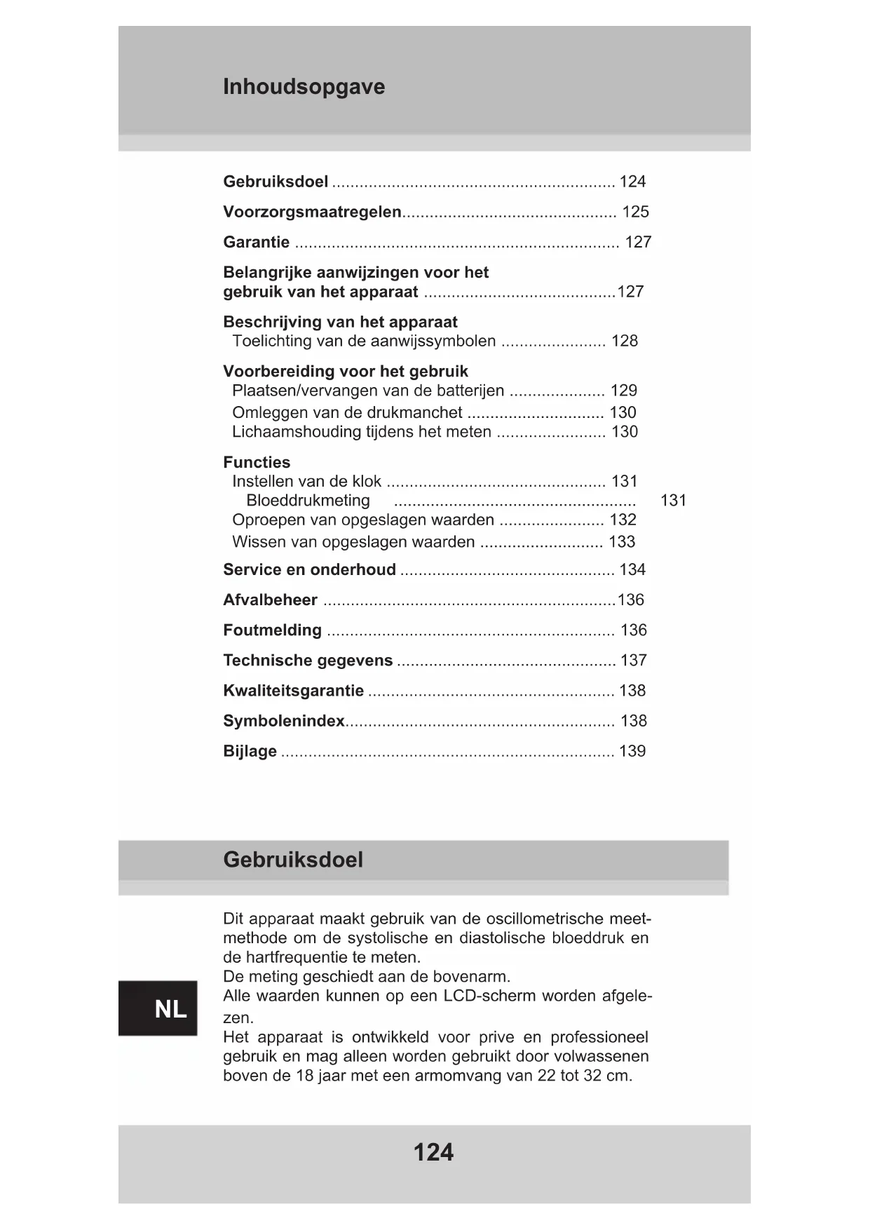 Afvalbeheer Uitgediende apparaten en lege batterijen dienen volgens de geldige voorschriften te worden afgevoerd. Dit apparaat mag niet samen met het huishoudelijk afval worden aan- geboden. Iedere consument is verplicht, alle elektrische of elektroni- sche apparaten, ongeacht of die schadelijke stoffen bevat- ten of niet, bij een milieudepot in zijn stad of bij de hande- laar af te geven, zodat ze op een milieuvriendelijke manier kunnen worden verwijderd. Haal de batterijen uit het apparaat voordat u het apparaat verwijdert. Gooi gebruikte batterijen niet bij het huisvuil, maar breng deze naar de daarvoor bestemde afvalverwerking of lever deze in bij een speciaal daarvoor bestemd inzamelstation bij de supermarkt of elektrawinke- lier. Foutmelding Melding Correctie De gemeten druk lag onder 20 mm Hg. Nogmaals meten a.u.b. Er werden lichaamsbewegingen vastgesteld tijdens de meting. Nogmaals meten a.u.b. Pompfout De manchet controleren en nogmaals verzoeken. De druk kan ten gevolge van sig- naalruis niet worden gemeten. Nogmaals meten a.u.b. De pompdruk ligt boven 300 mm Hg. Nogmaals meten a.u.b. Batterij leeg. De 4 batterijen controleren en, indien nodig, vervangen.137