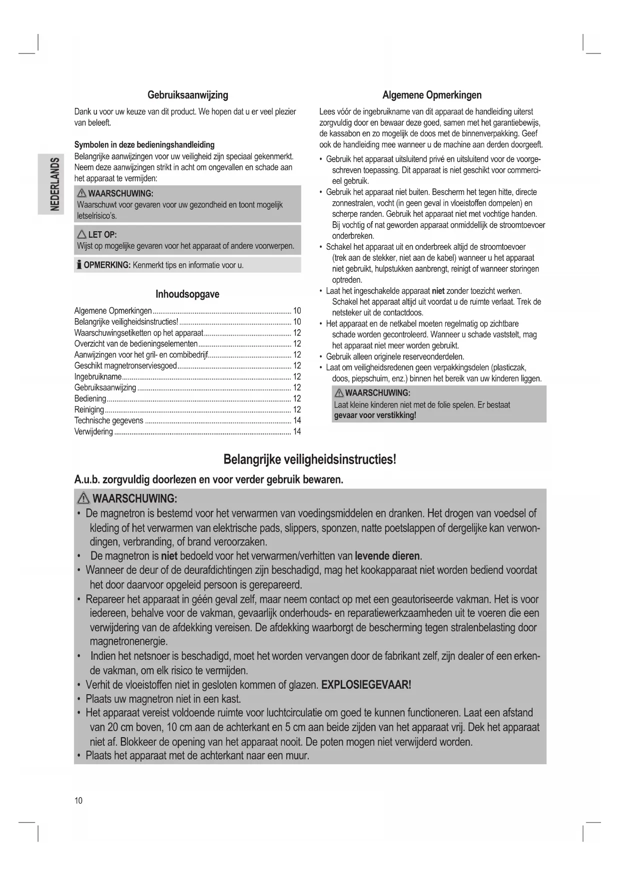 - De magnetron is bestemd voor het verwarmen van voedingsmiddelen en dranken. Het drogen van voedsel of kleding of het verwarmen van elektrische pads, slippers, sponzen, natte poetslappen of dergelijke kan verwon- dingen, verbranding, of brand veroorzaken.