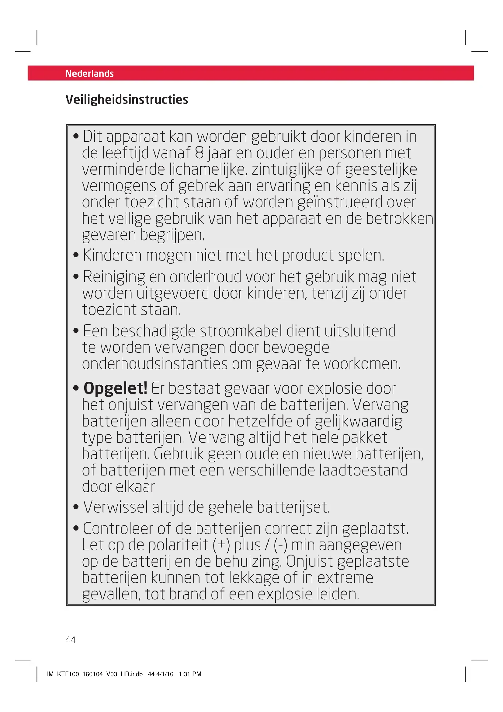 - Verwijder de batterijen uit het product voordat u het weggooit. Veiligheidsinstructies IM_KTF100_160104_V03_HR.indb 45 4/1/16 1:31 PMNederlands