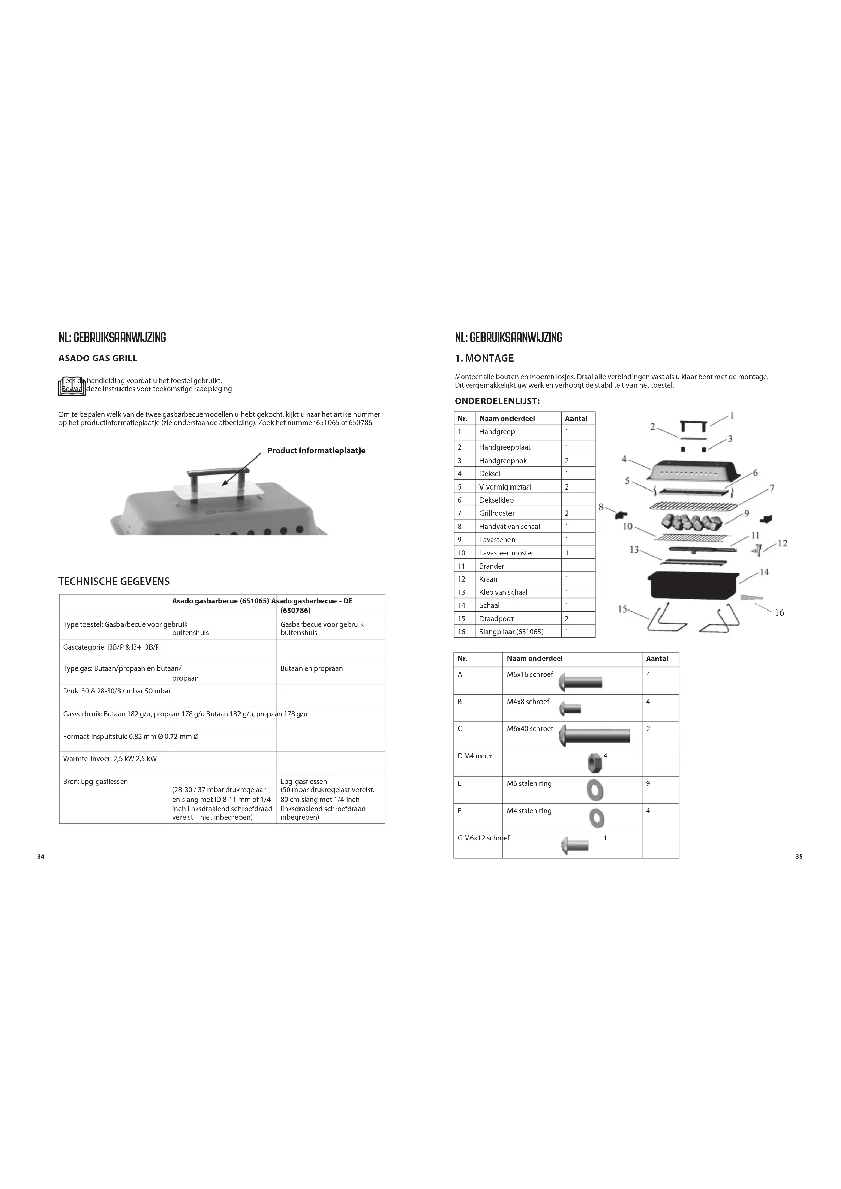 FR: MODE D'EMPLOILees de handleiding voordat u het toestel gebruikt. Bewaar deze instructies voor toekomstige raadpleging Om te bepalen welk van de twee gasbarbecuemodellen u hebt gekocht, kijkt u naar het artikelnummer op het productinformatieplaatje (zie onderstaande afbeelding). Zoek het nummer 651065 of 650786.Product informatieplaatje TECHNISCHE GEGEVENS Asado gasbarbecue (651065) Asado gasbarbecue – DE (650786)Type toestel: Gasbarbecue voor gebruik buitenshuisGasbarbecue voor gebruik buitenshuisGascategorie: I3B/P & I3+ I3B/PType gas: Butaan/propaan en butaan/propaanButaan en propraanDruk: 30 & 28-30/37 mbar 50 mbarGasverbruik: Butaan 182 g/u, propaan 178 g/u Butaan 182 g/u, propaan 178 g/uFormaat inspuitstuk: 0.82 mm Ø 0.72 mm ØWarmte-invoer: 2,5 kW 2,5 kWBron: Lpg-gasessen (28-30 / 37 mbar drukregelaar en slang met ID 8-11 mm of 1/4-inch linksdraaiend schroefdraad vereist – niet inbegrepen)Lpg-gasessen (50 mbar drukregelaar vereist. 80 cm slang met 1/4-inch linksdraaiend schroefdraad inbegrepen)