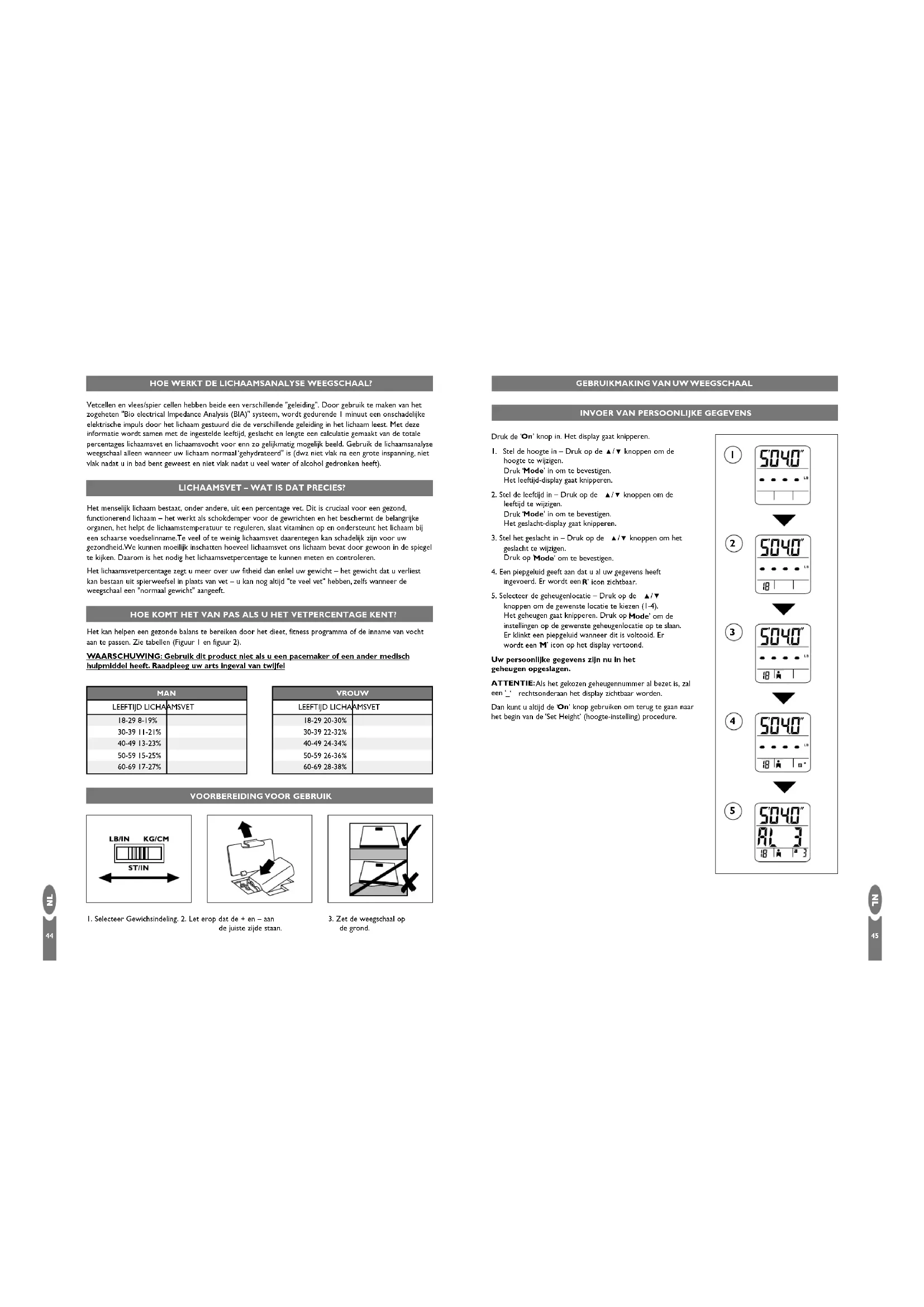 Het menselijk lichaam bestaat, onder andere, uit een percentage vet. Dit is cruciaal voor een gezond, functionerend lichaam – het werkt als schokdemper voor de gewrichten en het beschermt de belangrijke organen, het helpt de lichaamstemperatuur te reguleren, slaat vitaminen op en ondersteunt het lichaam bijeen schaarse voedselinname.Te veel of te weinig lichaamsvet daarentegen kan schadelijk zijn voor uwgezondheid.We kunnen moeilijk inschatten hoeveel lichaamsvet ons lichaam bevat door gewoon in de spiegelte kijken. Daarom is het nodig het lichaamsvetpercentage te kunnen meten en controleren. Het lichaamsvetpercentage zegt u meer over uw fitheid dan enkel uw gewicht – het gewicht dat u verliest kan bestaan uit spierweefsel in plaats van vet – u kan nog altijd "te veel vet" hebben, zelfs wanneer de weegschaal een "normaal gewicht" aangeeft. LICHAAMSVET – WAT IS DAT PRECIES? Het kan helpen een gezonde balans te bereiken door het dieet, fitness programma of de inname van vochtaan te passen. Zie tabellen (Figuur 1 en figuur 2). WAARSCHUWING: Gebruik dit product niet als u een pacemaker of een ander medisch hulpmiddel heeft. Raadpleeg uw arts ingeval van twijfel HOE KOMT HET VAN PAS ALS U HET VETPERCENTAGE KENT?