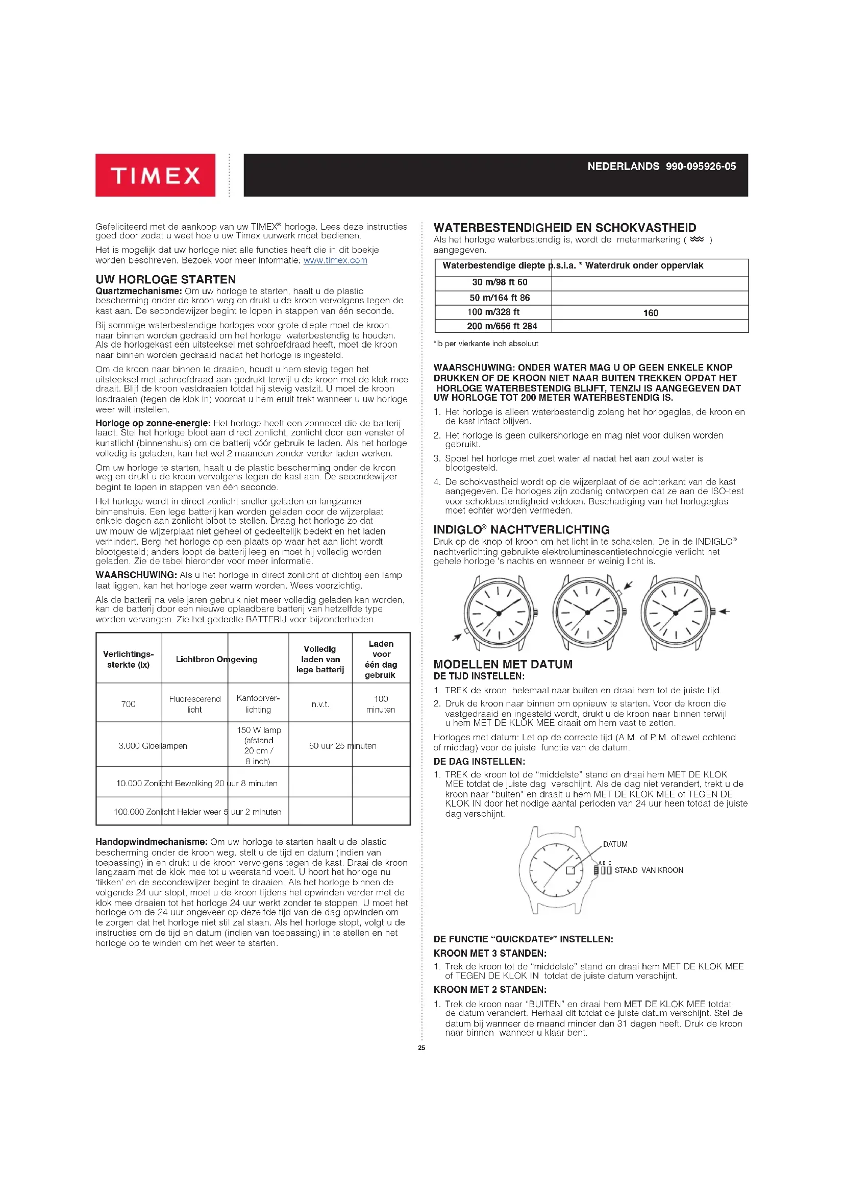 WED 14 DATUM CONTROLEREN(ALLEEN VOOR GEBRUIK DOOR FABRIEK)TIJD INSTELLENDAG, DATUMMIDDEN NAAR BUITENDE TIJD INSTELLENVoor het instellen van de tijd trekt u de kroon helemaal naar buiten en draait u hem. De dag en datum veranderen automatisch wanneer de tijd voorbij middernacht wordt afgesteld; er is geen extra stap voor het instellen van de dag of datum. Druk de kroon naar binnen wanneer u klaar bent.Als de datum na het instellen om twaalf uur ‘s middags verandert, moet de tijd 12 uur vooruit of achteruit worden bijgesteld.Als de kroon per ongeluk in de MIDDELSTE stand wordt gezet en wordt gedraaid, verandert het datumdisplay tijdelijk maar dit heeft geen invloed op de instelling van de datum. Trek de kroon helemaal naar buiten en stel de tijd in. Het juiste datumdisplay wordt hervat.HORLOGE MET EEUWIGE KALENDER GRATIS LEVENSLANGE VERVANGING VAN BATTERIJ**Als de batterij vervangen moet worden, raden wij aan om dit uitsluitend door TIMEX te laten doen. Uw horloge moet opnieuw op de juiste tijd en datum worden gekalibreerd nadat de batterij is vervangen. Om het horloge naar Timex te retourneren, gaat u naar de winkelier waar u het horloge heeft gekocht of naar www.timex.eu/en_GB/productWarranty.html voor informatie over contact opnemen met Timex. **Verzend- en behandelingskosten worden in rekening gebracht. STUUR NOOIT EEN SPECIAAL HORLOGEBANDJE OF ENIG ANDER ARTIKEL VAN PERSOONLIJKE WAARDE MEE.