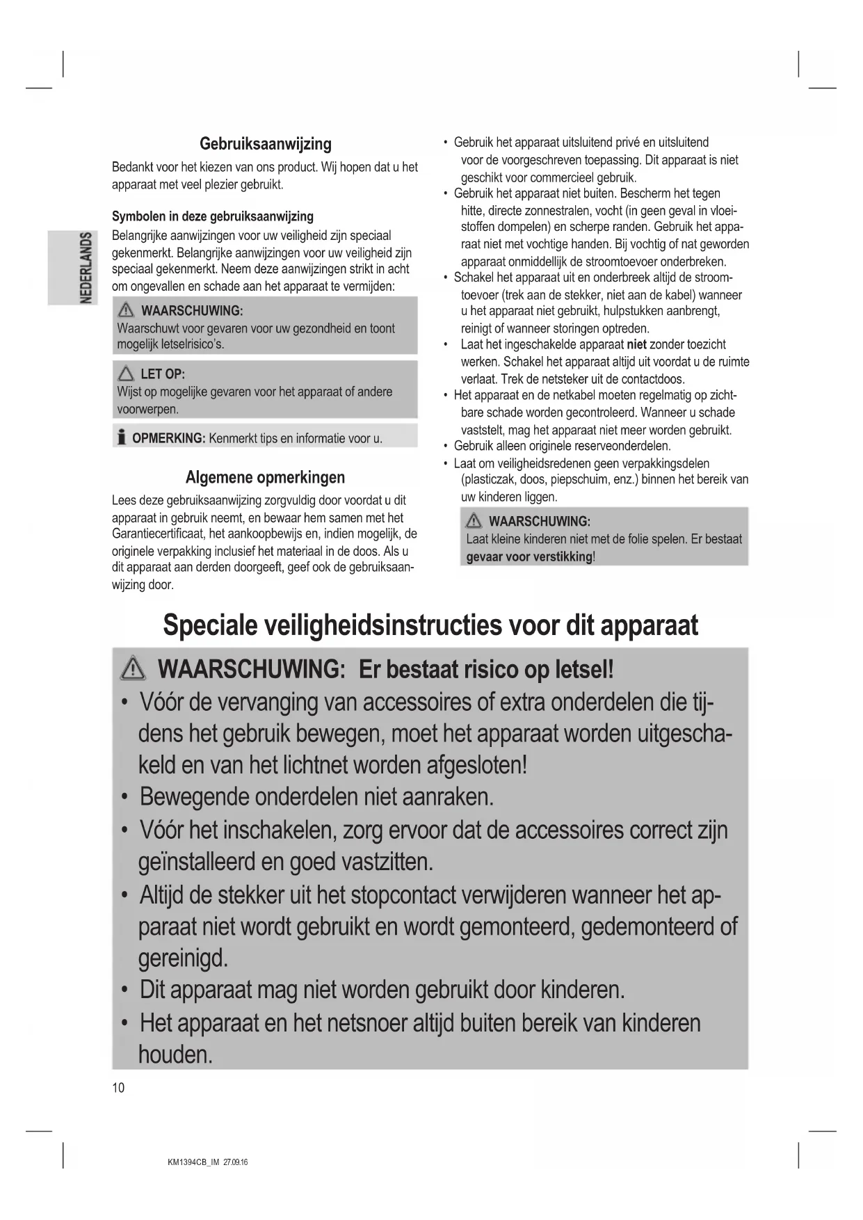 - Het apparaat en het netsnoer altijd buiten bereik van kinderen houden.11 KM1394CB_IM 27.09.16 WAARSCHUWING: Er bestaat risico op letsel!