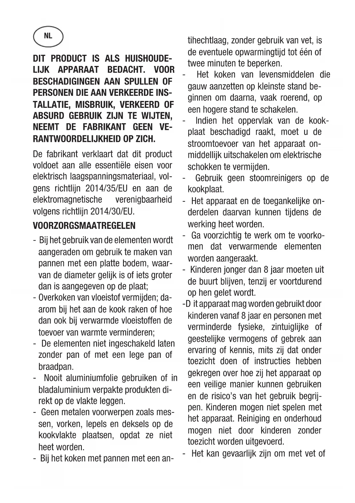 RANTWOORDELIJKHEID OP ZICH. De fabrikant verklaart dat dit product voldoet aan alle essentiële eisen voor elektrisch laagspanningsmateriaal, vol- gens richtlijn 2014/35/EU en aan de elektromagnetische verenigbaarheid volgens richtlijn 2014/30/EU. VOORZORGSMAATREGELEN - Bij het gebruik van de elementen wordt aangeraden om gebruik te maken van pannen met een platte bodem, waar- van de diameter gelijk is of iets groter dan is aangegeven op de plaat;