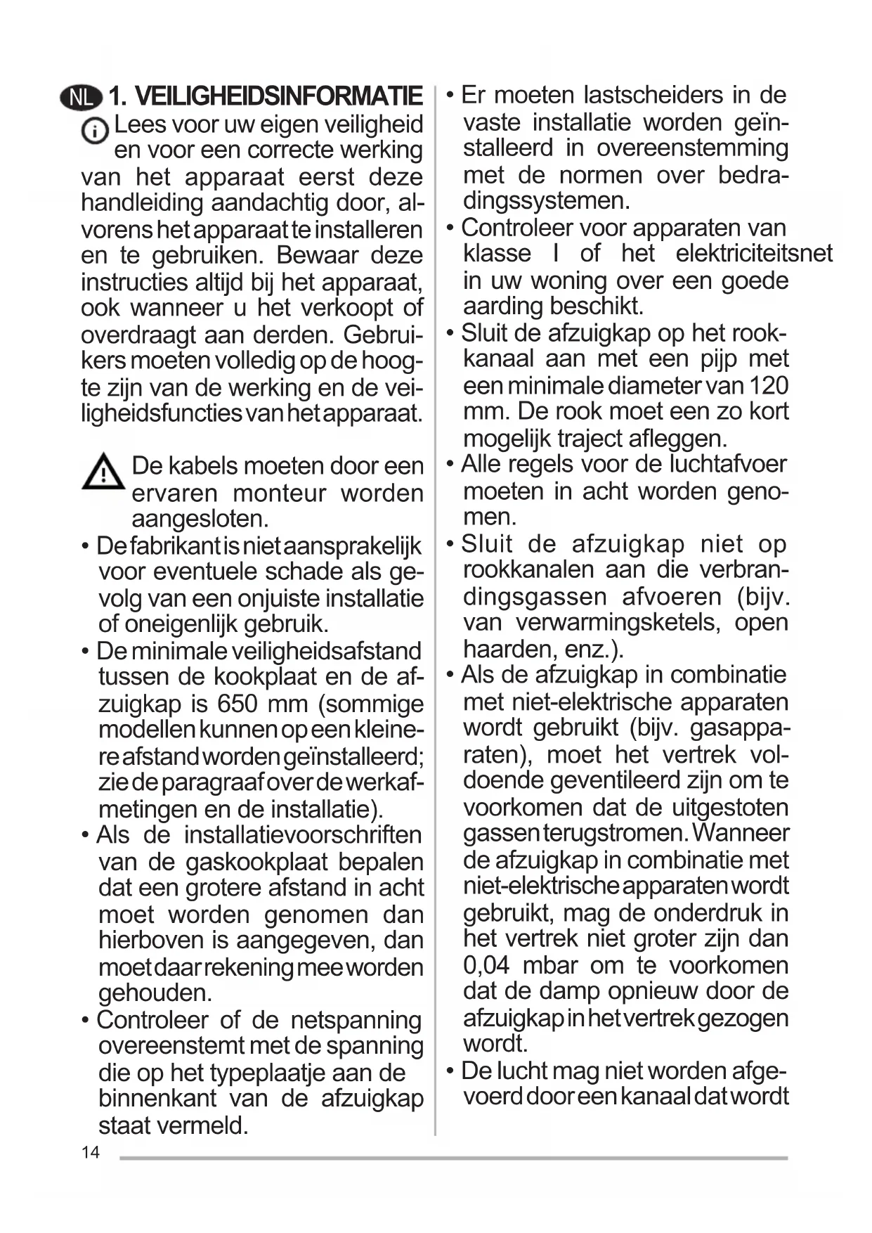 Lees voor uw eigen veiligheid en voor een correcte werking van het apparaat eerst deze handleiding aandachtig door, al- vorens het apparaat te installeren en te gebruiken. Bewaar deze instructies altijd bij het apparaat, ook wanneer u het verkoopt of overdraagt aan derden. Gebrui- kers moeten volledig op de hoog- te zijn van de werking en de vei- ligheidsfuncties van het apparaat. De kabels moeten door een ervaren monteur worden aangesloten.