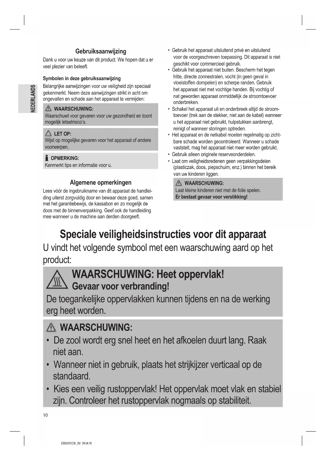 - Laat om veiligheidsredenen geen verpakkingsdelen (plasticzak, doos, piepschuim, enz.) binnen het bereik van uw kinderen liggen. WAARSCHUWING: Laat kleine kinderen niet met de folie spelen. Er bestaat gevaar voor verstikking! Speciale veiligheidsinstructies voor dit apparaat U vindt het volgende symbool met een waarschuwing aard op het product: WAARSCHUWING: Heet oppervlak! Gevaar voor verbranding! De toegankelijke oppervlakken kunnen tijdens en na de werking erg heet worden. WAARSCHUWING: