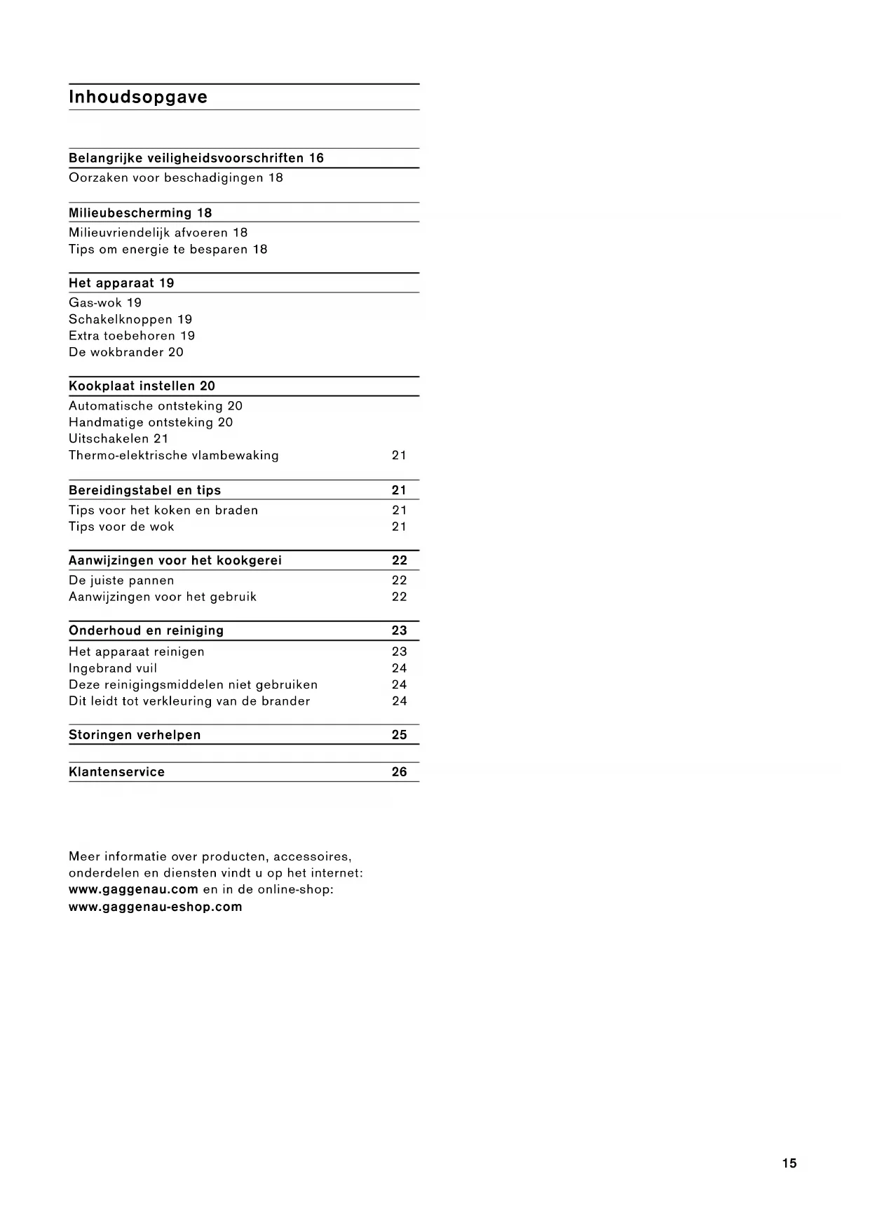A 0810 550 555 D 089 20 355 366 CH 0848 840 04015 Inhoudsopgave Gebruiksaanwijzing Belangrijke veiligheidsvoorschriften 16 Oorzaken voor beschadigingen 18 Milieubescherming 18 Milieuvriendelijk afvoeren 18 Tips om energie te besparen 18 Het apparaat 19 Gas-wok 19 Schakelknoppen 19 Extra toebehoren 19 De wokbrander 20 Kookplaat instellen 20 Automatische ontsteking 20 Handmatige ontsteking 20 Uitschakelen 21 Thermo-elektrische vlambewaking 21 Bereidingstabel en tips 21 Tips voor het koken en braden 21 Tips voor de wok 21 Aanwijzingen voor het kookgerei 22 De juiste pannen 22 Aanwijzingen voor het gebruik 22 Onderhoud en reiniging 23 Het apparaat reinigen 23 Ingebrand vuil 24 Deze reinigingsmiddelen niet gebruiken 24 Dit leidt tot verkleuring van de brander 24 Storingen verhelpen 25 Klantenservice 26 : Meer informatie over producten, accessoires, onderdelen en diensten vindt u op het internet: www.gaggenau.com en in de online-shop: www.gaggenau-eshop.com16 m Belangrijke veiligheidsvoorschriften Lees deze gebruiksaanwijzing zorgvuldig door. Alleen dan kunt u uw apparaat goed en veilig bedienen. Bewaar de gebruiksaanwijzing voor later gebruik of om door te geven aan een volgende eigenaar. Dit apparaat moet worden geïnstalleerd volgens het meegeleverde installatievoorschrift. Controleer het apparaat na het uitpakken. Niet aansluiten in geval van transportschade. Alleen een daartoe bevoegd vakman mag het toestel aansluiten. Bij schade door een verkeerde aansluiting maakt u geen aanspraak op garantie. Neem voor de omschakeling naar een ander type gas contact op met de klantenservice. Dit toestel is alleen bestemd voor huishoudelijk gebruik en de huiselijke omgeving. Het toestel alleen gebruiken voor de bereiding van voedsel en drank, nooit om te verwarmen. Houd het toestel tijdens het gebruik in de gaten. Het toestel mag alleen binnen worden gebruikt. Dit apparaat is bestemd voor gebruik tot op hoogten van maximaal 2.000 meter boven zeeniveau. Dit apparaat is niet bestemd voor gebruik met een externe tijdschakelklok of een afstandbediening. Maak voor de bescherming van kinderen geen gebruik van ongeschikte beveiligingsvoorzieningen of tralies. Dit kan leiden tot ongevallen. Dit toestel kan worden gebruikt door kinderen vanaf 8 jaar en door personen met beperkte fysieke, sensorische of geestelijke vermogens of personen die gebrek aan kennis of ervaring hebben, wanneer zij onder toezicht staan van een persoon die verantwoordelijk is voor hun veiligheid of geleerd hebben het op een veilige manier te gebruiken en zich bewust zijn van de risico's die het gebruik van het toestel met zich meebrengt. Kinderen mogen niet met het apparaat spelen. Reiniging en onderhoud van het toestel mogen niet worden uitgevoerd door kinderen, tenzij zij 8 jaar of ouder zijn en onder toezicht staan. Zorg ervoor dat kinderen die jonger zijn dan 8 jaar uit de buurt blijven van het toestel of de aansluitkabel.