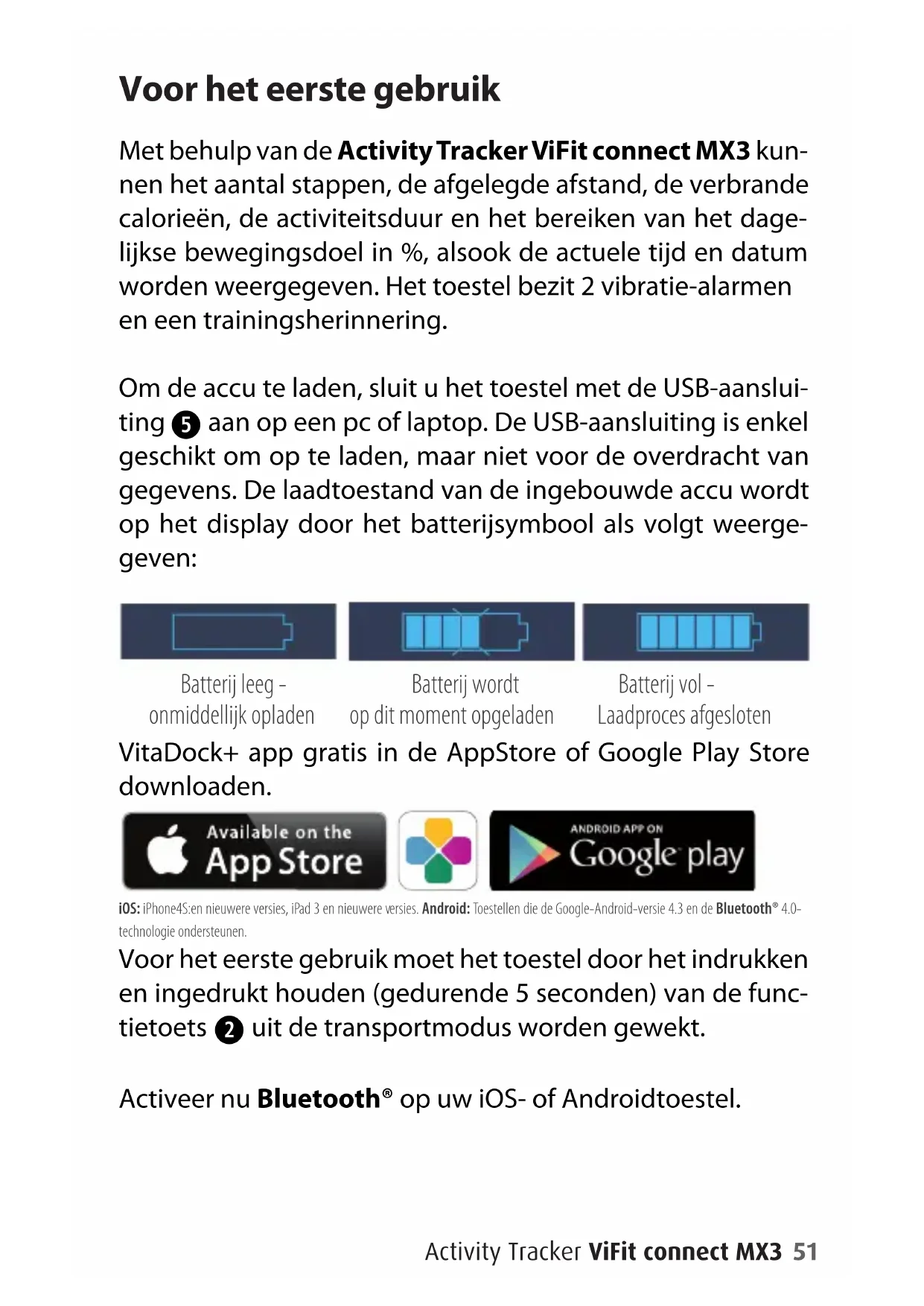 BedieningselementenActivity Tracker ViFit connect MX3 51 Voor het eerste gebruik Met behulp van de Activity Tracker ViFit connect MX3 kun- nen het aantal stappen, de afgelegde afstand, de verbrande calorieën, de activiteitsduur en het bereiken van het dage- lijkse bewegingsdoel in %, alsook de actuele tijd en datum worden weergegeven. Het toestel bezit 2 vibratie-alarmen en een trainingsherinnering. Om de accu te laden, sluit u het toestel met de USB-aanslui- ting