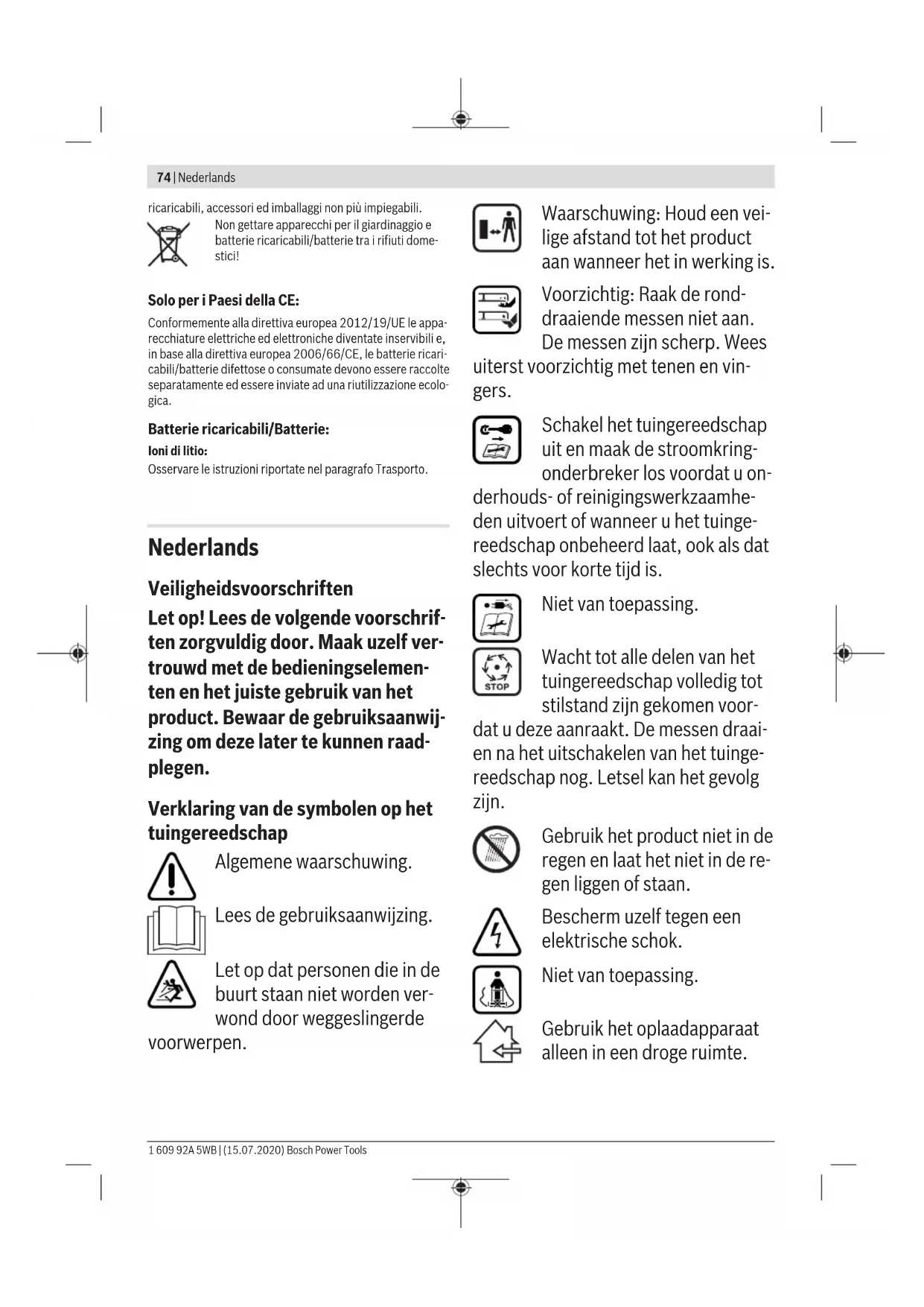 Per prolungare la durata è possibile acquistare una batteria ricaricabile supplementare tramite un Centro di Assistenza Clienti autorizzato per utensili da giardinaggio Bosch. Individuazione dei guasti e rimedi Problema Possibili cause Rimedi Il motore non funziona Cablaggio interno dell’apparecchio per il giardi- naggio difettoso Rivolgersi ad un Servizio Assistenza Clienti Bosch Batteria scarica Ricaricare la batteria Batteria troppo fredda/troppo calda Lasciare riscaldare/raffreddare la batteria Erba troppo lunga L'altezza massima dell'erba permessa è di 30 cm con la regolazione massima dell'altezza di taglio La protezione del motore è scattata Lasciare raffreddare il motore e regolare un’altez- za di taglio maggiore Ruttore del circuito elettrico è stato inserito non correttamente/non completamente Inserire correttamente L’apparecchio per il giardinaggio funziona con interruzioni Cablaggio interno dell’apparecchio per il giardi- naggio difettoso Rivolgersi ad un Servizio Assistenza Clienti Bosch La protezione del motore è scattata Lasciare raffreddare il motore e regolare un’altez- za di taglio maggiore L'apparecchio per il giardinaggio lascia tracce di taglio irrego- lari e/o il motore lavora con difficoltà Altezza di taglio troppo bassa Regolare una maggiore altezza di taglio Lama senza filo Sostituire la lama (vedi figura K) Possibile ostruzioni Spegnere l'apparecchio per il giardinaggio e ri- muovere il ruttore del circuito elettrico Controllare la parte inferiore dell’apparecchio per il giardinaggio e, se necessario, eliminare l’ostru- zione (mettere sempre guanti da giardino) Lama montata in posizione errata Montare la lama nella posizione corretta La lama da taglio non ruota dopo aver acceso l'apparecchio per il giardinaggio Lama bloccata da erba Spegnere l'apparecchio per il giardinaggio e ri- muovere il ruttore del circuito elettrico Eliminare l’ostruzione (mettere sempre guanti da giardino) Dado/vite della lama allentato/allentata Serrare saldamente dado/vite della lama (27Nm) Vibrazioni/rumori ec- cessivi Dado/vite della lama allentato/allentata Serrare saldamente dado/vite della lama (27Nm) 1 609 92A 5WB | (15.07.2020) Bosch Power ToolsItaliano | 73 Problema Possibili cause Rimedi Lama danneggiata Sostituire la lama (vedi figura K) Batteria ricaricabile e stazione di ricarica Problema Possibili cause Rimedi L'indicatore di carica della batteria rosso lampeggia sulla stazio- ne di ricarica Operazione di ricarica impossibile Batteria ricaricabile non inserita (correttamente) Inserire correttamente la batteria nella stazione di ricarica Contatti della batteria ricaricabile sporchi Pulire i contatti della batteria; ad. es. inserendo ed estraendo più volte la batteria, se necessario sostituire la batteria Batteria ricaricabile difettosa Sostituire la batteria Gli indicatori di carica della batteria non sono illuminati sulla stazione di ricarica Spina di rete della stazione di ricarica non inserita (correttamente) Inserire la spina di rete (completamente) nella presa di corrente Presa di corrente, cavo di rete oppure stazione di ricarica difettosi Controllare la tensione di rete e, eventualmente, far controllare la stazione di ricarica presso un centro di Assistenza Clienti elettroutensili Bosch autorizzato Manutenzione ed assistenza Cura della batteria ricaricabile u Attenzione! Spegnere l’apparecchio per il giardinag- gio, rimuovere il ruttore del circuito elettrico, togliere la batteria ricaricabile ed il sacco raccoglierba prima di effettuare interventi di manutenzione o di pulizia. u Mettere sempre guanti da giardino maneggiando o la- vorando nel settore delle lame taglienti. Osservare le seguenti indicazioni e provvedimenti per garan- tire un utilizzo ottimale della batteria ricaricabile: – Proteggere la batteria ricaricabile da umidità ed acqua. – Immagazzinare l’apparecchio per il giardinaggio e la bat- teria ricaricabile esclusivamente nel campo di temperatu- ra tra -20 °C e 50 °C. Ad es. in estate non lasciare in auto la batteria ricaricabile. – Immagazzinare la batteria ricaricabile separatamente e non nella stazione di ricarica. – In caso di irradiamento solare diretto non lasciare la bat- teria ricaricabile nell’apparecchio per il giardinaggio. – La temperatura ottimale per la conservazione della batte- ria ricaricabile è di 5 °C. – Pulire di tanto in tanto le fessure di ventilazione della bat- teria ricaricabile con un pennello morbido, pulito ed asciutto. Un tempo di funzionamento notevolmente ridotto dopo la ri- carica indica che la batteria ricaricabile è consumata e deve essere sostituita. Servizio di assistenza e consulenza tecnica Il servizio di assistenza risponde alle Vostre domande relati- ve alla riparazione e alla manutenzione del Vostro prodotto nonché concernenti i pezzi di ricambio. Disegni in vista esplosa e informazioni relative ai pezzi di ricambio sono con- sultabili anche sul sito www.bosch-pt.com Il team di consulenza tecnica Bosch sarà lieto di rispondere alle Vostre domande in merito ai nostri prodotti e accessori. In caso di richieste o di ordinazione di pezzi di ricambio, co- municare sempre il codice prodotto a 10cifre riportato sulla targhetta di fabbricazione dell’elettroutensile. Italia Tel.: (02) 3696 2314 E-Mail: pt.hotlinebosch@it.bosch.com Per ulteriori indirizzi del servizio assistenza consultare: www.bosch-pt.com/serviceaddresses Trasporto Le batterie ricaricabili agli ioni di litio contenute sono sogget- te ai requisiti di legge relativi a merci pericolose. Le batterie ricaricabili possono essere trasportate su strada tramite l’utente senza ulteriori precauzioni. In caso di spedizione tramite terzi (p. es.: trasporto aereo oppure spedizioniere) devono essere osservati particolari requisiti relativi ad imballo e marcatura. In questo caso per la preparazione del pezzo da spedire è necessario ricorrere ad un esperto per merce pericolosa. Spedire batterie ricaricabili solamente se