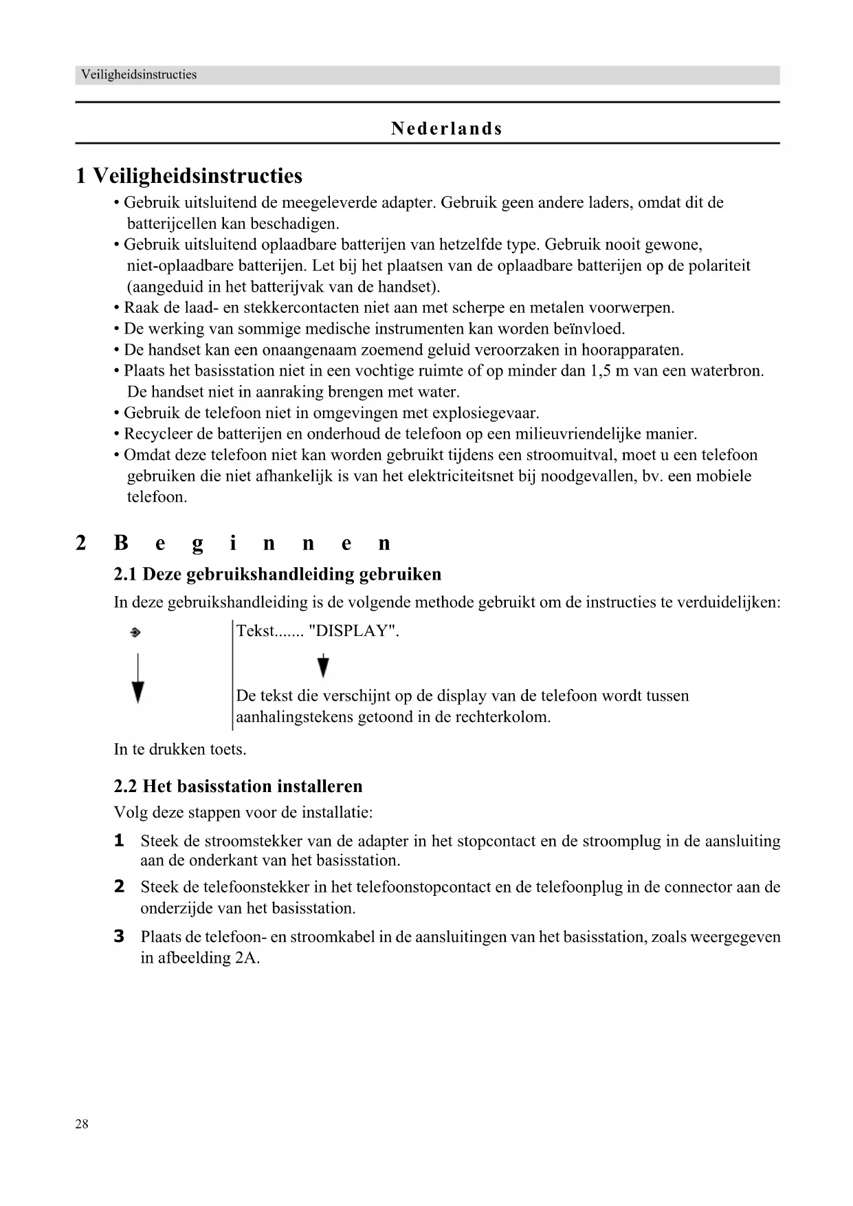 Volg deze stappen voor de installatie: 1 Steek de stroomstekker van de adapter in het stopcontact en de stroomplug in de aansluiting aan de onderkant van het basisstation. 2 Steek de telefoonstekker in het telefoonstopcontact en de telefoonplug in de connector aan de onderzijde van het basisstation. 3 Plaats de telefoon- en stroomkabel in de aansluitingen van het basisstation, zoals weergegeven in afbeelding 2A. Tekst....... "DISPLAY". De tekst die verschijnt op de display van de telefoon wordt tussen aanhalingstekens getoond in de rechterkolom.Nederlands