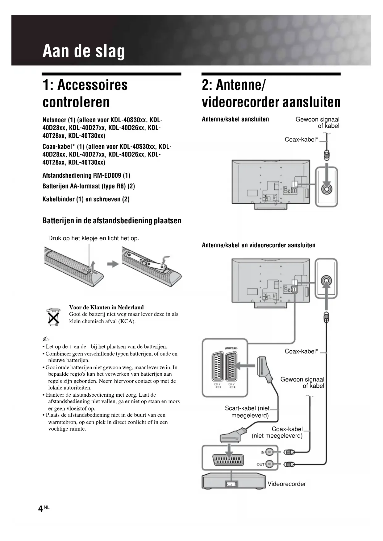 Aan de slag 1: Accessoires controleren Netsnoer (1) (alleen voor KDL-40S30xx, KDL- 40D28xx, KDL-40D27xx, KDL-40D26xx, KDL- 40T28xx, KDL-40T30xx) Coax-kabel* (1) (alleen voor KDL-40S30xx, KDL- 40D28xx, KDL-40D27xx, KDL-40D26xx, KDL- 40T28xx, KDL-40T30xx) Afstandsbediening RM-ED009 (1) Batterijen AA-formaat (type R6) (2) Kabelbinder (1) en schroeven (2) Batterijen in de afstandsbediening plaatsen Voor de Klanten in NederlandGooi de batterij niet weg maar lever deze in als klein chemisch afval (KCA).~ • Let op de + en de - bij het plaatsen van de batterijen.• Combineer geen verschillende typen batterijen, of oude en nieuwe batterijen.• Gooi oude batterijen niet gewoon weg, maar lever ze in. In bepaalde regio's kan het verwerken van batterijen aan regels zijn gebonden. Neem hiervoor contact op met de lokale autoriteiten.• Hanteer de afstandsbediening met zorg. Laat de afstandsbediening niet vallen, ga er niet op staan en mors er geen vloeistof op.• Plaats de afstandsbediening niet in de buurt van een warmtebron, op een plek in direct zonlicht of in een vochtige ruimte. 2: Antenne/ videorecorder aansluiten Druk op het klepje en licht het op.