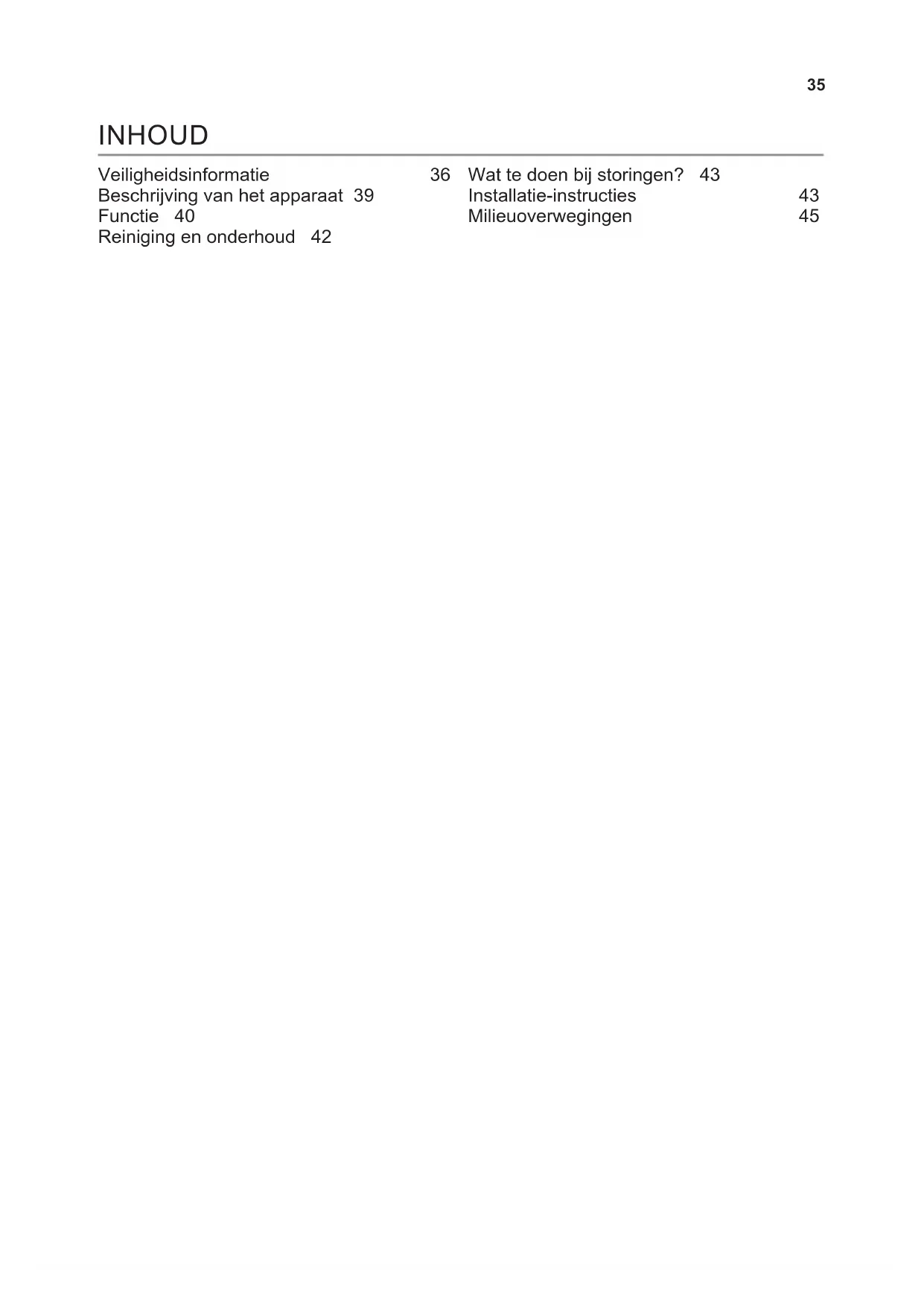 Veiligheidsinformatie 36 Beschrijving van het apparaat 39 Functie 40 Reiniging en onderhoud 42 Wat te doen bij storingen? 43 Installatie-instructies 43 Milieuoverwegingen 45 INHOUD36 VEILIGHEIDSINFORMATIE Lees zorgvuldig de meegeleverde instructies voor installatie en gebruik van het apparaat. De fabrikant is niet verantwo- ordelijk voor letsel en schade veroorzaakt door een foutie- ve installatie. Bewaar de instructies van het apparaat voor toekomstig gebruik. Dit apparaat voldoet aan de van kracht zijnde veiligheidsnormen. Onjuist gebruik kan de gebruiker in gevaar brengen. Veiligheid van kinderen en kwetsbare mensen OPGELET! Gevaar voor verstikking, letsel of perma- nente invaliditeit.