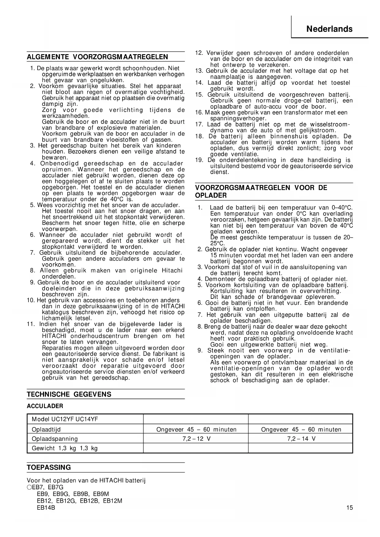 openingen van de oplader. Als een voorwerp of ontvlambaar materiaal in de ventilatie-openingen van de oplader wordt gestoken, kan dit resulteren in een elektrische schock of beschadiging aan de oplader. TECHNISCHE GEGEVENS ACCULADER Model UC12YF UC14YF Oplaadtijd Ongeveer 45 – 60 minuten Ongeveer 45 – 60 minuten Oplaadspanning 7,2 – 12 V 7,2 – 14 V Gewicht 1,3 kg 1,3 kg TOEPASSING Voor het opladen van de HITACHI batterij 䡬 EB7, EB7G EB9, EB9G, EB9B, EB9M EB12, EB12G, EB12B, EB12M EB14BNederlands