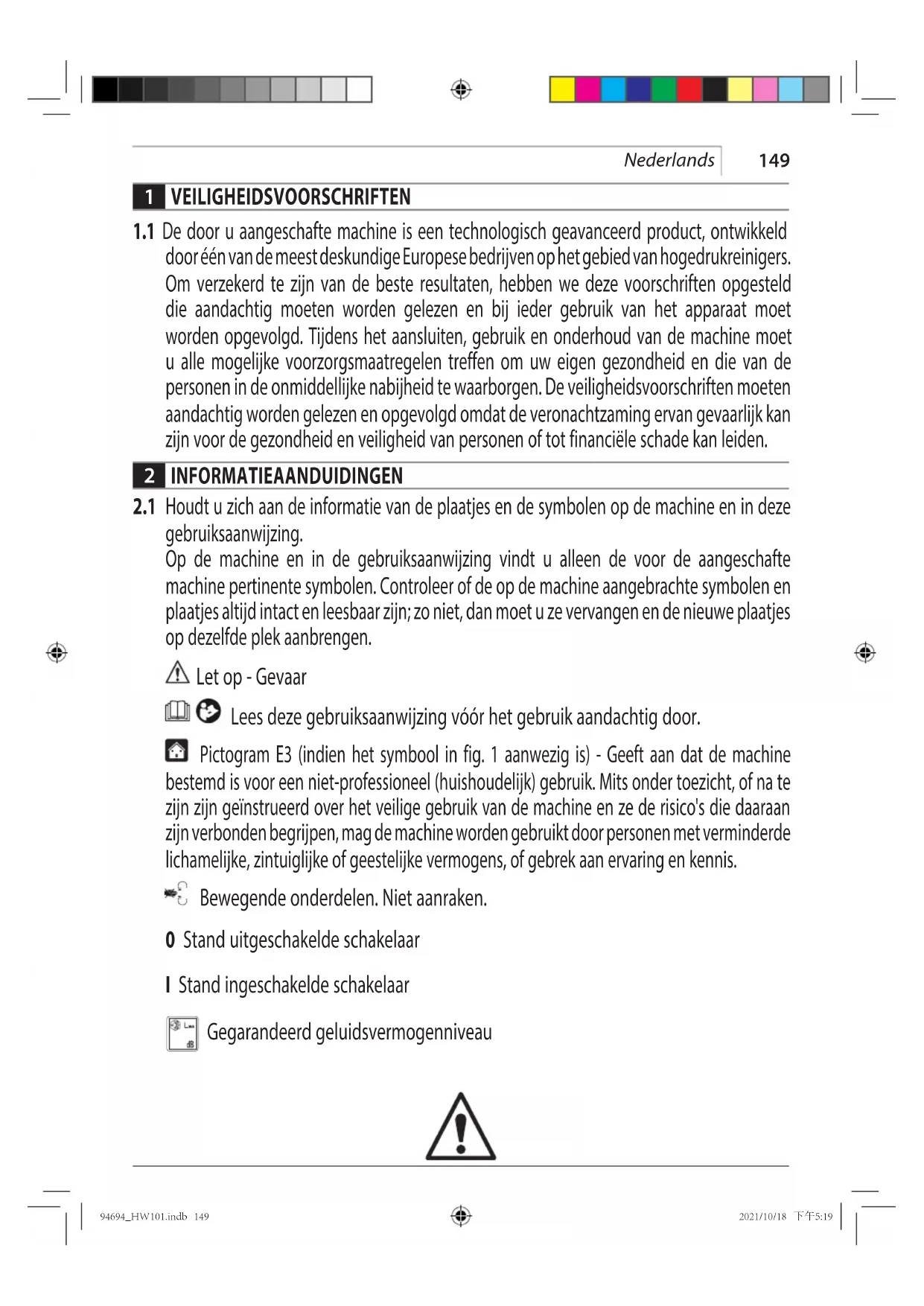 Houdt u zich aan de informatie van de plaatjes en de symbolen op de machine en in deze gebruiksaanwijzing. Op de machine en in de gebruiksaanwijzing vindt u alleen de voor de aangeschafte machine pertinente symbolen. Controleer of de op de machine aangebrachte symbolen en plaatjes altijd intact en leesbaar zijn; zo niet, dan moet u ze vervangen en de nieuwe plaatjes op dezelfde plek aanbrengen. Let op - Gevaar Lees deze gebruiksaanwijzing vóór het gebruik aandachtig door. Pictogram E3 (indien het symbool in fig. 1 aanwezig is) - Geeft aan dat de machine bestemd is voor een niet-professioneel (huishoudelijk) gebruik. Mits onder toezicht, of na te zijn zijn geïnstrueerd over het veilige gebruik van de machine en ze de risico's die daaraan zijn verbonden begrijpen, mag de machine worden gebruikt door personen met verminderde lichamelijke, zintuiglijke of geestelijke vermogens, of gebrek aan ervaring en kennis. Bewegende onderdelen. Niet aanraken. 0 Stand uitgeschakelde schakelaar I Stand ingeschakelde schakelaar Gegarandeerd geluidsvermogenniveau 94694_HW101.indb 14994694_HW101.indb 149 2021/10/18 下午5:192021/10/18 下午5:19150 Nederlands Verbod, informeert de gebruiker dat de nationale normenstelsels de aansluiting van het product op het drinkwaterdistributienetwerk kunnen verbieden. Gevaarsignaal om de gebruiker te informeren dat hij de waterstraal niet rechtstreeks op personen, dieren, elektrische apparaten of het product zelf mag richten. Dit product heeft een isolatieklasse II bescherming. Dit betekent dat hij is uitgerust met een versterkte of dubbele isolatie (alleen wanneer dit symbool op de machine is aangebracht). Dit product voldoet aan de toepasselijke Europese richtlijnen. Pictogram E1 - Wijst op de verplichting om de machine niet te verwerken als stedelijk afval; hij kan worden teruggegeven aan de distributeur bij aanschaf van een nieuwe machine. De elektrische en elektronische delen waaruit de machine is samengesteld mogen niet worden hergebruikt voor oneigenlijke doeleinden vanwege de aanwezigheid van schadelijke substanties voor de gezondheid. Alleen voor EU-landen Als gevolg van de aanwezigheid van schadelijke componenten in het apparaat, kunnen gebruikte elektrische en elektronische apparaten negatieve gevolgen hebben voor het milieu en de gezondheid van mensen. Gooi elektrische en elektronische apparaten niet met het huisvuil weg! In overeenstemming met de Europese richtlijn inzake oude elektrische en elektronische apparaten en de toepassing daarvan binnen de nationale wetgeving, dienen gebruikte elektrische en elektronische apparaten gescheiden te worden ingezameld en te worden ingeleverd bij een apart inzamelingspunt voor huishoudelijk afval dat de milieubeschermingsvoorschriften in acht neemt. Dit wordt op het apparaat aangegeven door het symbool van een doorgekruiste afvalcontainer. Gebruik gehoorbescherming. Gebruik een veiligheidsmasker. Gebruik ademhalingsbescherming. Gebruik veiligheidshandschoenen. Gebruik veiligheidsschoenen. Gebruik beschermende kleding. 94694_HW101.indb 15094694_HW101.indb 150 2021/10/18 下午5:192021/10/18 下午5:19151 Nederlands