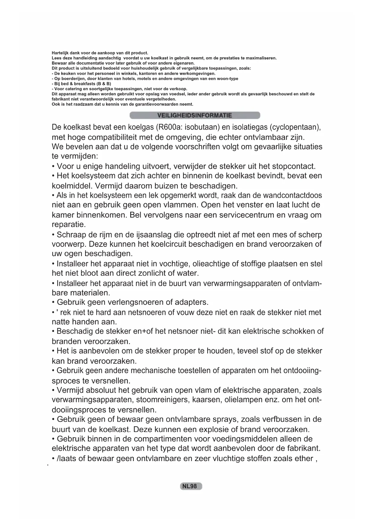NL97Hartelijk dank voor de aankoop van dit product. Lees deze handleiding aandachtig voordat u uw koelkast in gebruik neemt, om de prestaties te maximaliseren. Bewaar alle documentatie voor later gebruik of voor andere eigenaren. Dit product is uitsluitend bedoeld voor huishoudelijk gebruik of vergelijkbare toepassingen, zoals: - De keuken voor het personeel in winkels, kantoren en andere werkomgevingen. - Op boerderijen, door klanten van hotels, motels en andere omgevingen van een woon-type - Bij bed & breakfasts (B & B) - Voor catering en soortgelijke toepassingen, niet voor de verkoop. Dit apparaat mag alleen worden gebruikt voor opslag van voedsel, ieder ander gebruik wordt als gevaarlijk beschouwd en stelt de fabrikant niet verantwoordelijk voor eventuele vergetelheden. Ook is het raadzaam dat u kennis van de garantievoorwaarden neemt. De koelkast bevat een koelgas (R600a: isobutaan) en isolatiegas (cyclopentaan), met hoge compatibiliteit met de omgeving, die echter ontvlambaar zijn. We bevelen aan dat u de volgende voorschriften volgt om gevaarlijke situaties te vermijden: