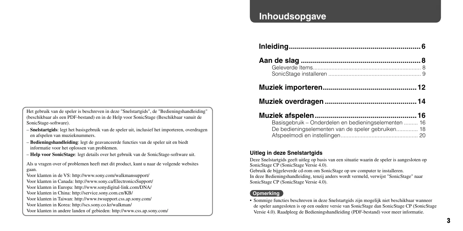- Muziek overdragen Het gebruik van de speler is beschreven in deze "Snelstartgids", de "Bedieningshandleiding" (beschikbaar als een PDF-bestand) en in de Help voor SonicStage (Beschikbaar vanuit de SonicStage-software). – Snelstartgids: legt het basisgebruik van de speler uit, inclusief het importeren, overdragen en afspelen van muzieknummers. – Bedieningshandleiding: legt de geavanceerde functies van de speler uit en biedt informatie voor het oplossen van problemen. – Help voor SonicStage: legt details over het gebruik van de SonicStage-software uit. Uitleg in deze Snelstartgids Als u vragen over of problemen heeft met dit product, kunt u naar de volgende websites gaan. Voor klanten in de VS: http://www.sony.com/walkmansupport/ Voor klanten in Canada: http://www.sony.ca/ElectronicsSupport/ Voor klanten in Europa: http://www.sonydigital-link.com/DNA/ Voor klanten in China: http://service.sony.com.cn/KB/ Voor klanten in Taiwan: http://www.twsupport.css.ap.sony.com/ Voor klanten in Korea: http://scs.sony.co.kr/walkman/ Voor klanten in andere landen of gebieden: http://www.css.ap.sony.com/ Opmerking p. 14