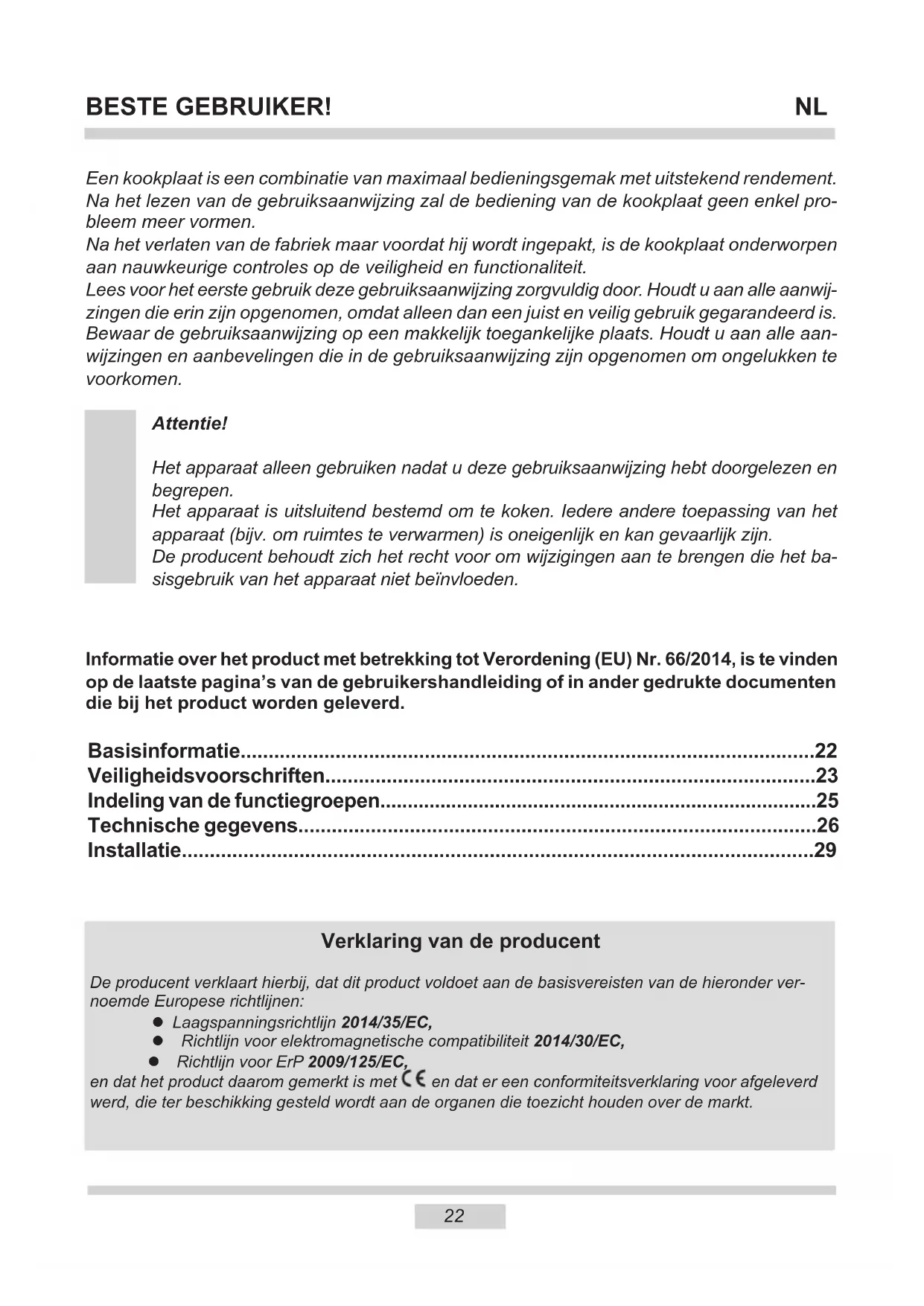 - BESTE GEBRUIKER! Een kookplaat is een combinatie van maximaal bedieningsgemak met uitstekend rendement. Na het lezen van de gebruiksaanwijzing zal de bediening van de kookplaat geen enkel pro- bleem meer vormen. Na het verlaten van de fabriek maar voordat hij wordt ingepakt, is de kookplaat onderworpen aan nauwkeurige controles op de veiligheid en functionaliteit. Lees voor het eerste gebruik deze gebruiksaanwijzing zorgvuldig door. Houdt u aan alle aanwij- zingen die erin zijn opgenomen, omdat alleen dan een juist en veilig gebruik gegarandeerd is. Bewaar de gebruiksaanwijzing op een makkelijk toegankelijke plaats. Houdt u aan alle aan- wijzingen en aanbevelingen die in de gebruiksaanwijzing zijn opgenomen om ongelukken te voorkomen. Attentie! Het apparaat alleen gebruiken nadat u deze gebruiksaanwijzing hebt doorgelezen en begrepen. Het apparaat is uitsluitend bestemd om te koken. Iedere andere toepassing van het apparaat (bijv. om ruimtes te verwarmen) is oneigenlijk en kan gevaarlijk zijn. De producent behoudt zich het recht voor om wijzigingen aan te brengen die het ba- sisgebruik van het apparaat niet beïnvloeden. Verklaring van de producent De producent verklaart hierbij, dat dit product voldoet aan de basisvereisten van de hieronder ver- noemde Europese richtlijnen: l Laagspanningsrichtlijn 2014/35/EC, l Richtlijn voor elektromagnetische compatibiliteit 2014/30/EC, lRichtlijn voor ErP 2009/125/EC, en dat het product daarom gemerkt is met en dat er een conformiteitsverklaring voor afgeleverd werd, die ter beschikking gesteld wordt aan de organen die toezicht houden over de markt. Basisinformatie p. 22