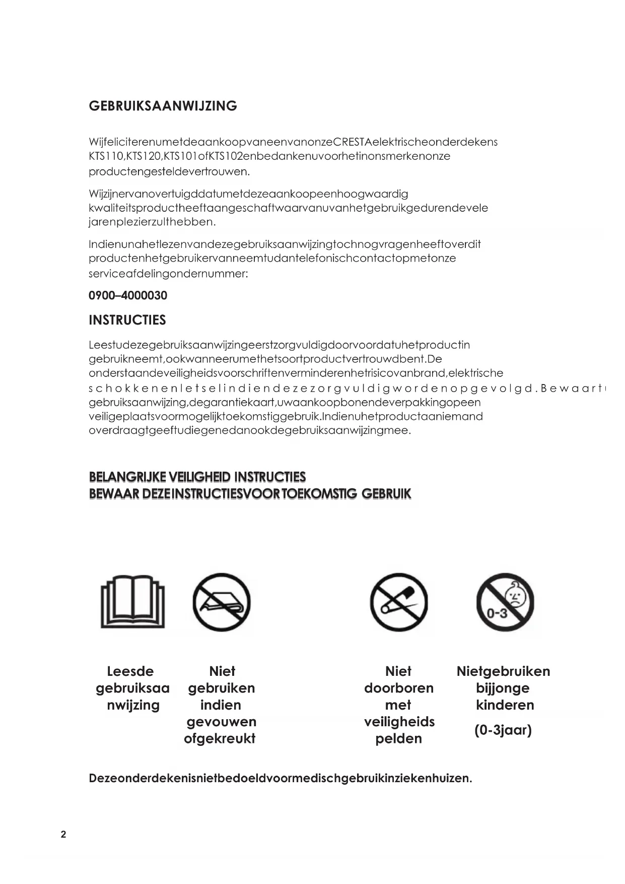 Wij feliciteren u met de aankoop van een van onze CRESTA elektrische onderdekens KTS 110, KTS 120, KTS 101 of KTS 102 en bedanken u voor het in ons merk en onze producten gestelde vertrouwen. Wij zijn ervan overtuigd dat u met deze aankoop een hoogwaardig kwaliteitsproduct heeft aangeschaft waarvan u van het gebruik gedurende vele jaren plezier zult hebben. Indien u na het lezen van deze gebruiksaanwijzing toch nog vragen heeft over dit product en het gebruik ervan neemt u dan telefonisch contact op met onze serviceafdel ing onder nummer: 0900 – 4000030 INSTRUCTIES Leest u deze gebruiksaanwijzing eerst zorgvuldig door voordat u het product in gebruik neemt, ook wanneer u met het soort product vertrouwd bent. De onderstaande veiligheidsvoorschriften verminderen het risico van brand, elektrische schokkenenletselindiendezezorgvuldigwordenopgevolgd.Bewaartudeze gebruiksaanwijzing, de garantiekaart, uw aankoop bon en de verpakking op een veilige plaats voor mogelijk toekomstig gebruik. Indien u het product aan iemand overdraagt geeft u diegene dan ook de gebruiksaanwijzing mee. BELANGRIJKE BELANGRIJKE VEILIGHEID VEILIGHEID IN STR U C TI E S IN STR U C TI E S BEWAAR BEWAAR DE ZE DE ZE IN STR U C TI E S IN STR U C TI E S VOOR VOOR TOEKOMSTIG TOEKOMSTIG GEBRUIK GEBRUIK Lees de gebruiksaa nwijzing Niet gebruiken indien gevouwen of gekreukt Niet doorboren met veiligheids pelden Niet gebruiken bij jonge kinderen (0-3 jaar) Deze onderdeken is niet bedoeld voor medisch gebruik in ziekenhuizen. LEES DEZE INSTRUCTIES AANDACHTIG DOOR EN VOLG DE AANWIJZINGEN Gebruik de onderdeken uitsluitend als elektrische matras verwarmer. Sluit alleen aan op een netwerk met het voltage zoals vermeld op het product label. De elektrische onderdeken mag niet gevouwen of gekreukeld worden gebruikt. Gebruik de elektrische onderdeken niet als laken, leg hem niet onder een matras en stop hem niet als een l aken in. Gebruik de onderdeken niet bij personen die zich niet zonder hulp kunnen bewegen, kleine kinderen, personen die ongevoelig zijn voor warmte, of dieren. Personen die slechts tot een bepaalde hoogte gevoelig zijn voor warmte mogen de onderdeken alleen onder toezicht gebruiken. Steek geen spelden of andere scherpe voorwerpen in de onderdeken. Trek of draai niet aan het netsnoer. Stel de schakelaar niet bloot aan vocht of vloeistoffen. Wanneer de zekering doorgebrand is of de thermische verbinding verstoord, dient u de deken ter reparatie in te leveren bij de zaak waar u deze gekocht heeft. Schakel de deken niet meer in. Wanneer het netsnoer beschadigd is dient dit vervangen te worden d oor de importeur of diens service afdeling, dan wel door een gekwalificeerde persoon, om gevaarlijke situaties te voorkomen. Vermijd het kreukelen van de onderdeken. Controleer de onderdeken regelmatig op gebreken of tekenen van slijtage. Wanneer zich dergelijke tekenen voordoen of wanneer de onderdeken niet correct gebruikt is, dient u met het gebruik te stoppen en de deken in te leveren bij de zaak waar u deze gekocht heeft. Schakel de onderdeken niet meer in. Gebruik de elektrische onderdeken niet wanneer hij vochtig of nat is. De onderdeken mag niet ingeschakeld worden door er een tijdschakelaar tussen te plaatsen. Vouw de elektrische onderdeken niet te strak op. Wanneer de onderdeken ingeschakeld is: Plaats dan geen grote of zware voorwerpen, zoals koffers e.d., op de onderdeken Plaats geen warmtebron zoals een kruik of een verwarmingsplaatje op de onderdeken. Zorg dat de schakelaar niet afgedekt is door dekens, kussens e.d. en ga niet onder de elektrische onderdeken liggen. Plaats de schakelaar vrij naast het bed zodat deze niet wordt afgedekt en er geen extra warmte rond de controller ontstaat. Vouw de onderdeken niet op wanneer deze nog warm is. Wanneer u de onderdeken niet da