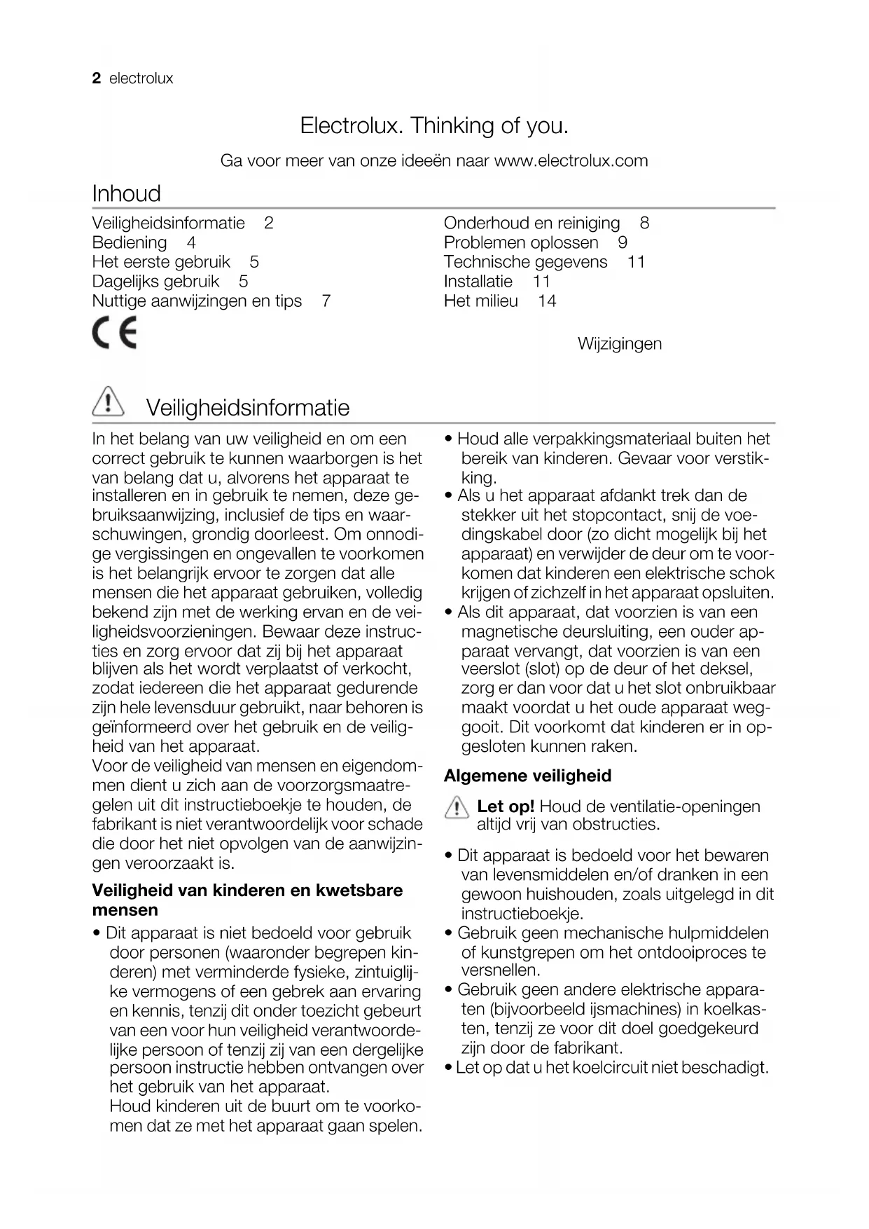 - de deur goed open en dicht gaat. Als de omgevingstemperatuur laag is (bijv. in de winter), kan het zijn dat de pakking niet precies op de kast past. Wacht in dat geval tot de pakking op natuurlijke wijze passend wordt. Als u bovenstaande handelingen liever niet zelf uitvoert, neem dan contact op met de dichtstbijzijnde Klantenservice. De deskun- dige van de Klantenservice zal de draairich- ting van de deuren op uw kosten veranderen. Het milieu Het symbool op het product of op de verpakking wijst erop dat dit product niet als huishoudafval mag worden behandeld, maar moet worden afgegeven bij een verzamelpunt waar elektrische en elektronische apparatuur wordt gerecycled. Als u ervoor zorgt dat dit product op de juiste manier wordt verwijderd, voorkomt u mogelijke negatieve gevolgen voor mens en milieu die zich zouden kunnen voordoen in geval van verkeerde afvalverwerking. Voor gedetailleerdere informatie over het recyclen van dit product, kunt u contact opnemen met de gemeente, de gemeentereiniging of de winkel waar u het product hebt gekocht. 14 electroluxElectrolux. Thinking of you. Share more of our thinking at www.electrolux.com Contents Safety information 15 Operation 17 First use 17 Daily use 18 Helpful hints and tips 19 Care and cleaning 20 What to do if… 21 Technical data 23 Installation 23 Environmental concerns 26 Subject to change without notice Safety information In the interest of your safety and to ensure the correct use, before installing and first us- ing the appliance, read this user manual carefully, including its hints and warnings. To avoid unnecessary mistakes and accidents, it is important to ensure that all people using the appliance are thoroughly familiar with its operation and safety features. Save these in- structions and make sure that they remain with the appliance if it is moved or sold, so that everyone using it through its life will be properly informed on appliance use and safe- ty. For the safety of life and property keep the precautions of these user's instructions as the manufacturer is not responsible for dam- ages caused by omission. Children and vulnerable people safety