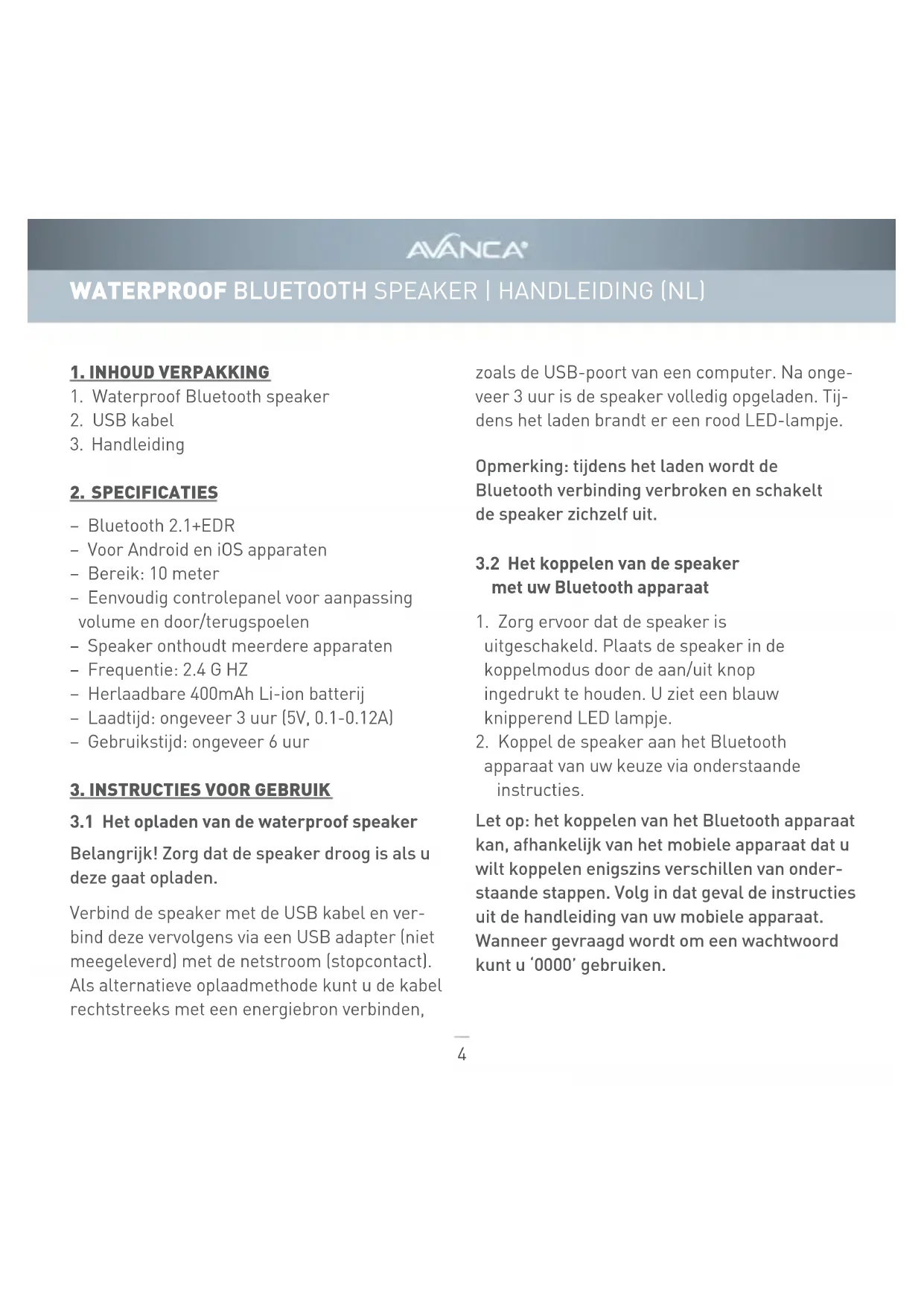 GEBRUIKSAANWIJZING Waterproof Avanca