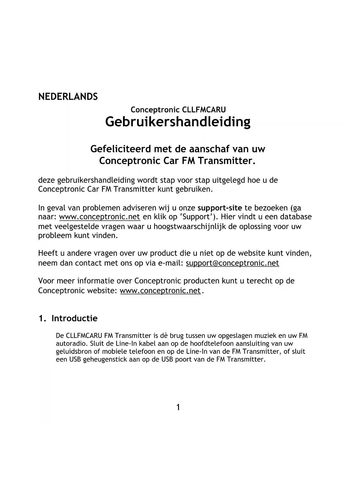 Conceptronic CLLFMCARU Gebruikershandleiding Gefeliciteerd met de aanschaf van uw Conceptronic Car FM Transmitter. deze gebruikershandleiding wordt stap voor stap uitgelegd hoe u de Conceptronic Car FM Transmitter kunt gebruiken. In geval van problemen adviseren wij u onze support-site te bezoeken (ga naar: www.conceptronic.net en klik op ‘Support’). Hier vindt u een database met veelgestelde vragen waar u hoogstwaarschijnlijk de oplossing voor uw probleem kunt vinden. Heeft u andere vragen over uw product die u niet op de website kunt vinden, neem dan contact met ons op via e-mail: support@conceptronic.net