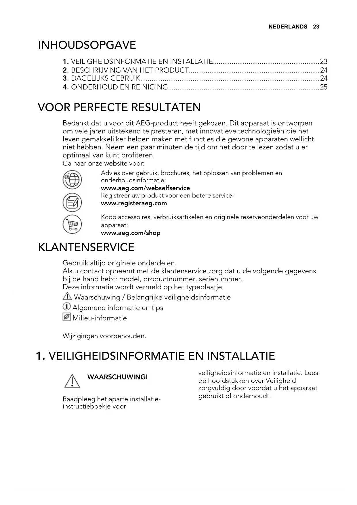 Bedankt dat u voor dit AEG-product heeft gekozen. Dit apparaat is ontworpen om vele jaren uitstekend te presteren, met innovatieve technologieën die het leven gemakkelijker helpen maken met functies die gewone apparaten wellicht niet hebben. Neem een paar minuten de tijd om het door te lezen zodat u er optimaal van kunt profiteren. Ga naar onze website voor: Advies over gebruik, brochures, het oplossen van problemen en onderhoudsinformatie: www.aeg.com/webselfservice Registreer uw product voor een betere service: www.registeraeg.com Koop accessoires, verbruiksartikelen en originele reserveonderdelen voor uw apparaat: www.aeg.com/shop KLANTENSERVICE Gebruik altijd originele onderdelen. Als u contact opneemt met de klantenservice zorg dat u de volgende gegevens bij de hand hebt: model, productnummer, serienummer. Deze informatie wordt vermeld op het typeplaatje. Waarschuwing / Belangrijke veiligheidsinformatie Algemene informatie en tips Milieu-informatie Wijzigingen voorbehouden.