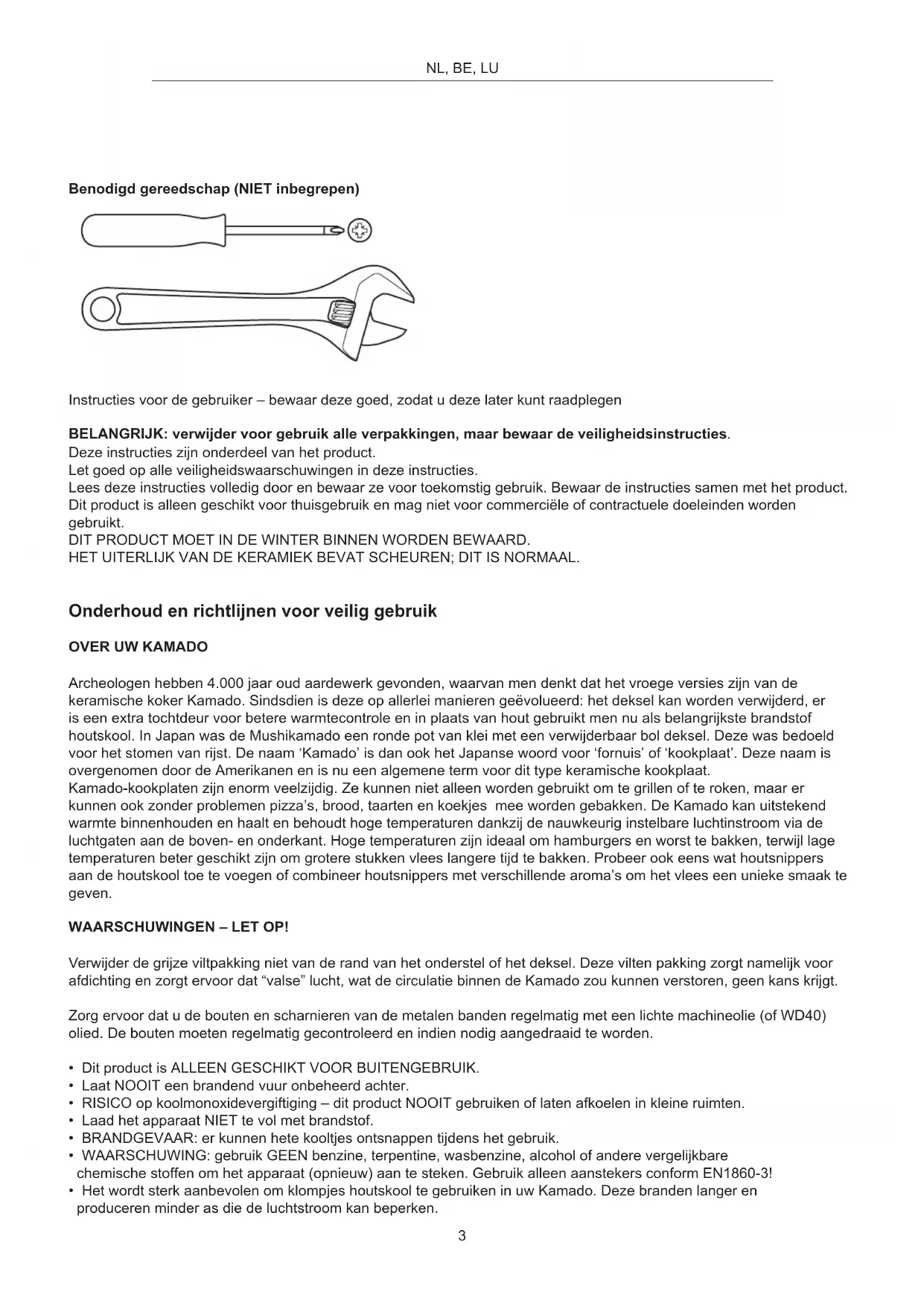 Kamado 13” PATTON B.V. Veilingweg 2 NL 5301 KM Zaltbommel Holland Website: www.patton.eu2 NL, BE, LU NL, BE, LU FR, CH GB, IE DE, CH, AT Gebruiksaanwijzing - 3 Notice d’emploi - 12 Operating instructions - 23 Gebrauchsanweisung - 333 NL, BE, LU Benodigd gereedschap (NIET inbegrepen) Instructies voor de gebruiker – bewaar deze goed, zodat u deze later kunt raadplegen BELANGRIJK: verwijder voor gebruik alle verpakkingen, maar bewaar de veiligheidsinstructies. Deze instructies zijn onderdeel van het product. Let goed op alle veiligheidswaarschuwingen in deze instructies. Lees deze instructies volledig door en bewaar ze voor toekomstig gebruik. Bewaar de instructies samen met het product. Dit product is alleen geschikt voor thuisgebruik en mag niet voor commerciële of contractuele doeleinden worden gebruikt. DIT PRODUCT MOET IN DE WINTER BINNEN WORDEN BEWAARD. HET UITERLIJK VAN DE KERAMIEK BEVAT SCHEUREN; DIT IS NORMAAL. Onderhoud en richtlijnen voor veilig gebruik
