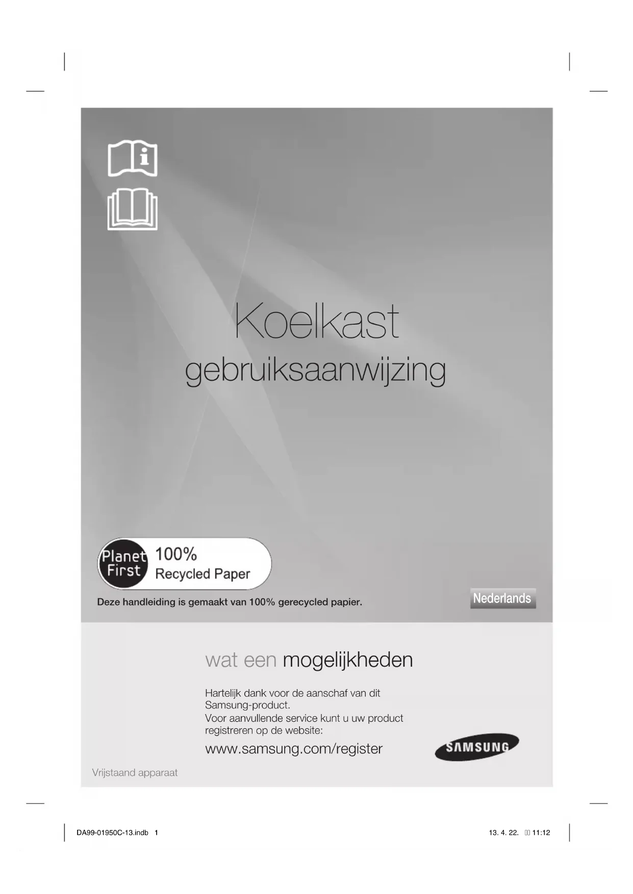 de achterkant van het product. Hoe het product te installeren Zorg ervoor dat de stroom voor beide producten uit staat Aan de grond vastmaker AAan de grond vastmaker B DA99-01950C-13.indb 2:20DA99-01950C-13.indb 2:20 13. 4. 22. 11:1213. 4. 22. 11:12memo DA99-01950C-13.indb 2:21DA99-01950C-13.indb 2:21 13. 4. 22. 11:1213. 4. 22. 11:12memo DA99-01950C-13.indb 2:22DA99-01950C-13.indb 2:22 13. 4. 22. 11:1213. 4. 22. 11:12memo DA99-01950C-13.indb 2:23DA99-01950C-13.indb 2:23 13. 4. 22. 11:1213. 4. 22. 11:12Ambient Room Temperature Limits Deze koelkast is ontworpen om in omgevingstemperatuur te functioneren gespecifi ceerd in de temperatuurklasse aangegeven op het typeplaatje. Klasse Symbol Bereik omgevingstemperatuur (°C) Uitgebreid gematigd SN +10 tot +32 Gematigd N +16 tot +32 Subtropisch ST +16 tot +38 Tropisch T +16 tot +43 Interne temperaturen kunnen worden beïnvloed door factoren als de plaats van de koelkast, de omgevingstemperatuur en hoe vaak de koelkast geopend en gesloten wordt. Pas de temperatuur zover aan als nodig is om deze factoren te compenseren. NETHERLANDS TEL. 0900-SAMSUNG (0900-7267864) (0,10/Min) www.samsung.com Samsung Electronics Benelux B.V. Olof Palmestraat 10, Delft postbus 681, 2600 AR Delft LUXEMBURG TEL. 261 03 710 www.samsung.com Samsung Electronics Benelux B.V. Airport Plaza, Geneva Building Leonardo Da Vincilaan 19 1831 Diegem België BELGIUM TEL. 0032 (0)2 201 24 18 www.samsung.com/be (Dutch) www.samsung.com/be_fr (French) Samsung Electronics Benelux B.V. Airport Plaza, Geneva Building Leonardo Da Vincilaan 19 1831 Diegem België Netherlands Correcte verwijdering van dit product (elektrische & elektronische afvalapparatuur) (Van toepassing in landen waar afval gescheiden wordt ingezameld) Dit merkteken op het product, de accessoires of het informatiemateriaal duidt erop dat het product en zijn elektronische accessoires (bv. lader, headset, USB-kabel) niet met ander huishoudelijk afval verwijderd mogen worden aan het einde van hun gebruiksduur. Om mogelijke schade aan het milieu of de menselijke gezondheid door ongecontroleerde afvalverwijdering te voorkomen, moet u deze artikelen van andere soorten afval scheiden en op een verantwoorde manier recyclen, zodat het duurzame hergebruik van materiaalbronnen wordt bevorderd. Huishoudelijke gebruikers moeten contact opnemen met de winkel waar ze dit product hebben gekocht of met de gemeente waar ze wonen om te vernemen waar en hoe ze deze artikelen milieuvriendelijk kunnen laten recyclen. Zakelijke gebruikers moeten contact opnemen met hun leverancier en de algemene voorwaarden van de koopovereenkomst nalezen. Dit product en zijn elektronische accessoires mogen niet met ander bedrijfsafval voor verwijdering worden gemengd. DA99-01950C-13.indb 2:24DA99-01950C-13.indb 2:24 13. 4. 22. 11:1213. 4. 22. 11:12