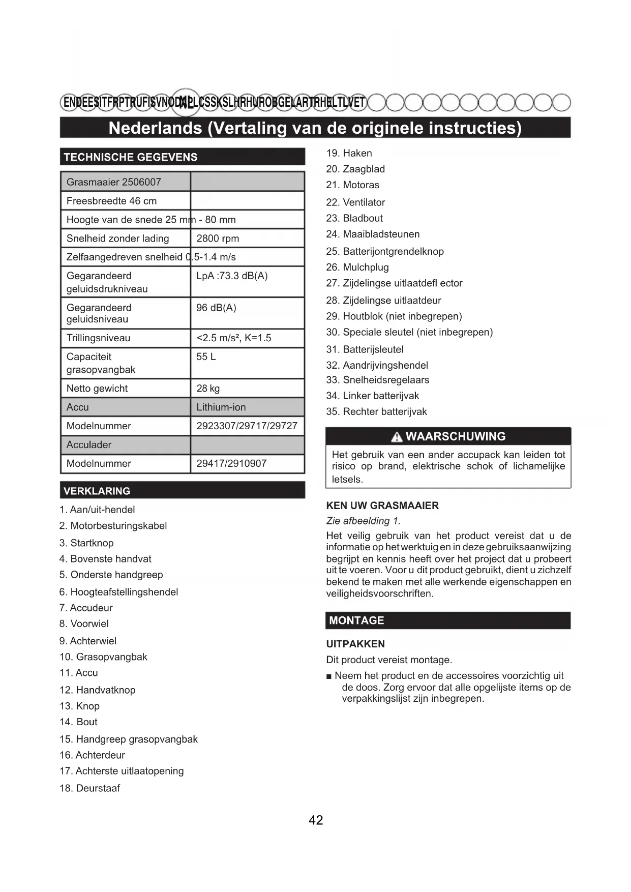 Bout 15. Handgreep grasopvangbak16. Achterdeur17. Achterste uitlaatopening18. Deurstaaf19. Haken20. Zaagblad21. Motoras22. Ventilator23. Bladbout24. Maaibladsteunen25. Batterijontgrendelknop 26. Mulchplug27. Zijdelingse uitlaatdefl ector28. Zijdelingse uitlaatdeur29. Houtblok (niet inbegrepen)30. Speciale sleutel (niet inbegrepen)31. Batterijsleutel 32. Aandrijvingshendel 33. Snelheidsregelaars34. Linker batterijvak35. Rechter batterijvak WAARSCHUWING Het gebruik van een ander accupack kan leiden tot risico op brand, elektrische schok of lichamelijke letsels. KEN UW GRASMAAIERZie afbeelding 1.Het veilig gebruik van het product vereist dat u de informatie op het werktuig en in deze gebruiksaanwijzing begrijpt en kennis heeft over het project dat u probeert uit te voeren. Voor u dit product gebruikt, dient u zichzelf bekend te maken met alle werkende eigenschappen en veiligheidsvoorschriften.MONTAGEUITPAKKENDit product vereist montage. ■ Neem het product en de accessoires voorzichtig uit de doos. Zorg ervoor dat alle opgelijste items op de verpakkingslijst zijn inbegrepen. 42Nederlands (Vertaling van de originele instructies)