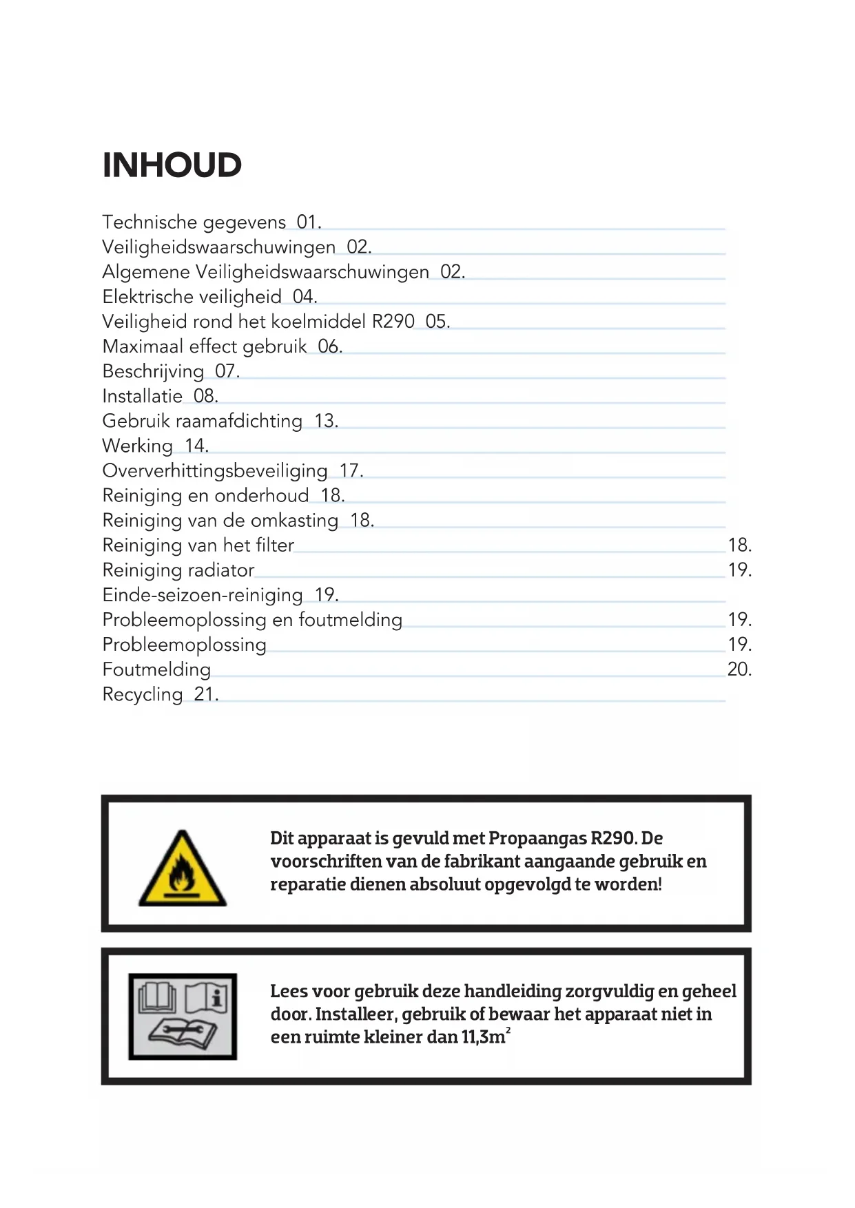 - Als de elektrokabel, stekker of het apparaat zelf beschadigd of stuk is, dan wel storingen vertoont, gebruik hem dan niet of schakel hem onmiddellijk uit en neem de stekker uit het stopcontact. Apparaat, stekker en/of kabel dienen door een elektricien of een vergelijkbaar gekwaliceerd persoon te worden gerepareerd/vervangen. Reparaties door ondeskundigen doen de garantie vervallen en kunnen gevaarlijke situaties veroorzaken! Veiligheid rond het koelmiddel R290