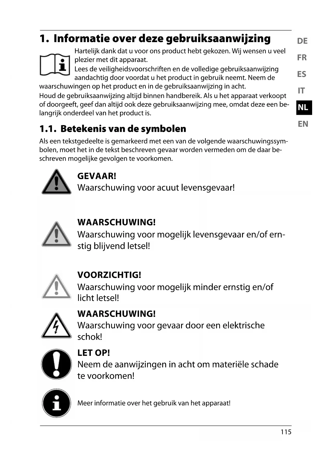 Hartelijk dank dat u voor ons product hebt gekozen. Wij wensen u veel plezier met dit apparaat. Lees de veiligheidsvoorschriften en de volledige gebruiksaanwijzing aandachtig door voordat u het product in gebruik neemt. Neem de waarschuwingen op het product en in de gebruiksaanwijzing in acht. Houd de gebruiksaanwijzing altijd binnen handbereik. Als u het apparaat verkoopt of doorgeeft, geef dan altijd ook deze gebruiksaanwijzing mee, omdat deze een be- langrijk onderdeel van het product is. 1.1. Betekenis van de symbolen Als een tekstgedeelte is gemarkeerd met een van de volgende waarschuwingssym- bolen, moet het in de tekst beschreven gevaar worden vermeden om de daar be- schreven mogelijke gevolgen te voorkomen. GEVAAR! Waarschuwing voor acuut levensgevaar! WAARSCHUWING! Waarschuwing voor mogelijk levensgevaar en/of ern- stig blijvend letsel! VOORZICHTIG! Waarschuwing voor mogelijk minder ernstig en/of licht letsel! WAARSCHUWING! Waarschuwing voor gevaar door een elektrische schok! LET OP! Neem de aanwijzingen in acht om materiële schade te voorkomen! Meer informatie over het gebruik van het apparaat!116 Neem de aanwijzingen in de gebruiksaanwijzing in acht!