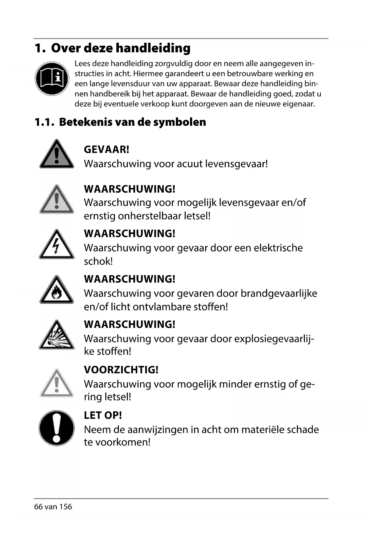 65 van 1561. Over deze handleiding Lees deze handleiding zorgvuldig door en neem alle aangegeven in- structies in acht. Hiermee garandeert u een betrouwbare werking en een lange levensduur van uw apparaat. Bewaar deze handleiding bin- nen handbereik bij het apparaat. Bewaar de handleiding goed, zodat u deze bij eventuele verkoop kunt doorgeven aan de nieuwe eigenaar. 1.1. Betekenis van de symbolen GEVAAR! Waarschuwing voor acuut levensgevaar! WAARSCHUWING! Waarschuwing voor mogelijk levensgevaar en/of ernstig onherstelbaar letsel! WAARSCHUWING! Waarschuwing voor gevaar door een elektrische schok! WAARSCHUWING! Waarschuwing voor gevaren door brandgevaarlijke en/of licht ontvlambare stoffen! WAARSCHUWING! Waarschuwing voor gevaar door explosiegevaarlij- ke stoffen! VOORZICHTIG! Waarschuwing voor mogelijk minder ernstig of ge- ring letsel! LET OP! Neem de aanwijzingen in acht om materiële schade te voorkomen! 66 van 156OPMERKING! Aanvullende informatie over het gebruik van dit apparaat! OPMERKING! Neem de aanwijzingen in de handleiding in acht!