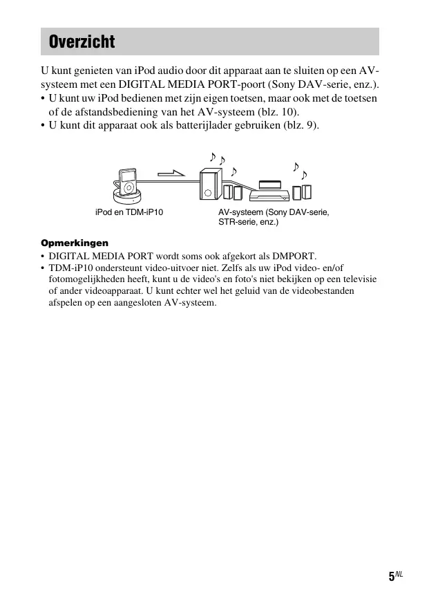 - Dit product is specifiek ontwikkeld voor iPod en is gecertificeerd volgens de prestatienormen van Apple Inc. 3NL Inhoudsopgave Overzicht ...............................5 Voorbereidingen 1: De bijgeleverde accessoires controleren .........................6 2: Overzicht van de onderdelen..........................6 3: Installeren van de TDM-iP10 ..........................7 De iPod bedienen Basisbediening ....................10 Aanvullende informatie Verhelpen van storingen .....11 Voorzorgsmaatregelen ........12 Technische gegevens...........13 4NL Overzicht U kunt genieten van iPod audio door dit apparaat aan te sluiten op een AVsysteem met een DIGITAL MEDIA PORT-poort (Sony DAV-serie, enz.).