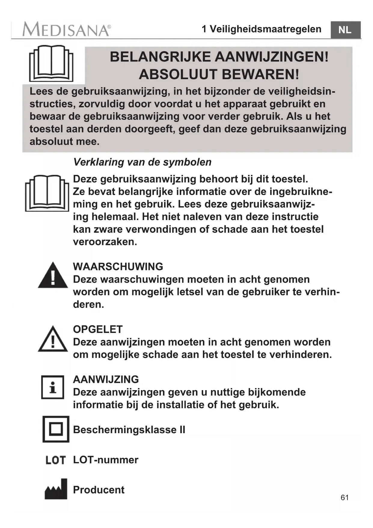 Verklaring van de symbolen Deze gebruiksaanwijzing behoort bij dit toestel. Ze bevat belangrijke informatie over de ingebruikne- ming en het gebruik. Lees deze gebruiksaanwijz- ing helemaal. Het niet naleven van deze instructie kan zware verwondingen of schade aan het toestel veroorzaken. WAARSCHUWING Deze waarschuwingen moeten in acht genomen worden om mogelijk letsel van de gebruiker te verhin- deren. OPGELET Deze aanwijzingen moeten in acht genomen worden om mogelijke schade aan het toestel te verhinderen. AANWIJZING Deze aanwijzingen geven u nuttige bijkomende informatie bij de installatie of het gebruik. Beschermingsklasse II LOT-nummer Producent Lees de gebruiksaanwijzing, in het bijzonder de veiligheidsin- structies, zorvuldig door voordat u het apparaat gebruikt en bewaar de gebruiksaanwijzing voor verder gebruik. Als u het toestel aan derden doorgeeft, geef dan deze gebruiksaanwijzing absoluut mee. BELANGRIJKE AANWIJZINGEN! ABSOLUUT BEWAREN!62 1 Veiligheidsmaatregelen
