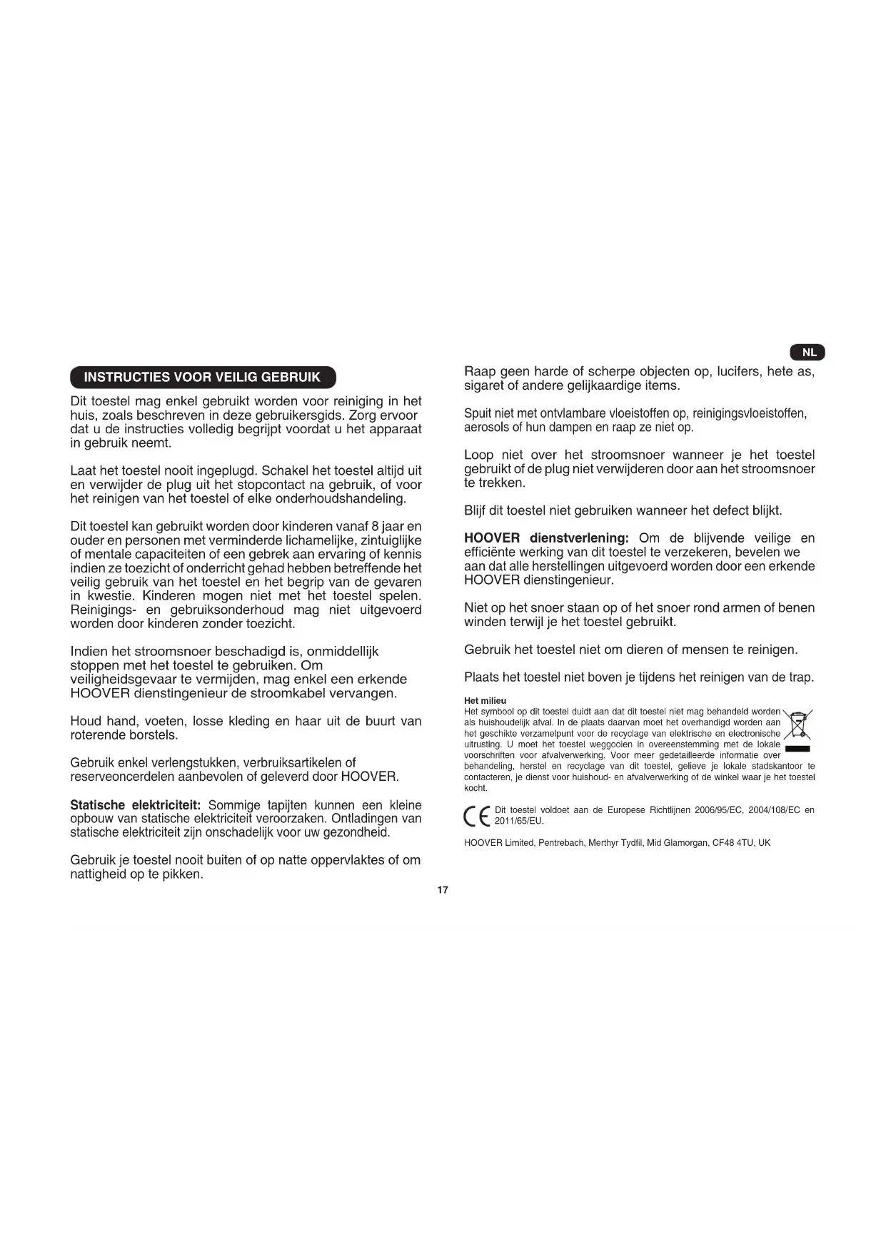Dit toestel mag enkel gebruikt worden voor reiniging in het huis, zoals beschreven in deze gebruikersgids. Zorg ervoor dat u de instructies volledig begrijpt voordat u het apparaat in gebruik neemt. Laat het toestel nooit ingeplugd. Schakel het toestel altijd uit en verwijder de plug uit het stopcontact na gebruik, of voor het reinigen van het toestel of elke onderhoudshandeling. Dit toestel kan gebruikt worden door kinderen vanaf 8 jaar en ouder en personen met verminderde lichamelijke, zintuiglijke of mentale capaciteiten of een gebrek aan ervaring of kennis indien ze toezicht of onderricht gehad hebben betreffende het veilig gebruik van het toestel en het begrip van de gevaren in kwestie. Kinderen mogen niet met het toestel spelen. Reinigings- en gebruiksonderhoud mag niet uitgevoerd worden door kinderen zonder toezicht. Indien het stroomsnoer beschadigd is, onmiddellijk stoppen met het toestel te gebruiken. Om veiligheidsgevaar te vermijden, mag enkel een erkende HOOVER dienstingenieur de stroomkabel vervangen. Houd hand, voeten, losse kleding en haar uit de buurt van roterende borstels. Gebruik enkel verlengstukken, verbruiksartikelen of reserveoncerdelen aanbevolen of geleverd door HOOVER. Statische elektriciteit: Sommige tapijten kunnen een kleine opbouw van statische elektriciteit veroorzaken. Ontladingen van statische elektriciteit zijn onschadelijk voor uw gezondheid. Gebruik je toestel nooit buiten of op natte oppervlaktes of om nattigheid op te pikken. Raap geen harde of scherpe objecten op, lucifers, hete as, sigaret of andere gelijkaardige items. Spuit niet met ontvlambare vloeistoffen op, reinigingsvloeistoffen, aerosols of hun dampen en raap ze niet op. Loop niet over het stroomsnoer wanneer je het toestel gebruikt of de plug niet verwijderen door aan het stroomsnoer te trekken. Blijf dit toestel niet gebruiken wanneer het defect blijkt. HOOVER dienstverlening: Om de blijvende veilige en efciënte werking van dit toestel te verzekeren, bevelen we aan dat alle herstellingen uitgevoerd worden door een erkende HOOVER dienstingenieur. Niet op het snoer staan op of het snoer rond armen of benen winden terwijl je het toestel gebruikt. Gebruik het toestel niet om dieren of mensen te reinigen. Plaats het toestel niet boven je tijdens het reinigen van de trap. Het milieu Het symbool op dit toestel duidt aan dat dit toestel niet mag behandeld worden als huishoudelijk afval. In de plaats daarvan moet het overhandigd worden aan het geschikte verzamelpunt voor de recyclage van elektrische en electronische uitrusting. U moet het toestel weggooien in overeenstemming met de lokale voorschriften voor afvalverwerking. Voor meer gedetailleerde informatie over behandeling, herstel en recyclage van dit toestel, gelieve je lokale stadskantoor te contacteren, je dienst voor huishoud- en afvalverwerking of de winkel waar je het toestel kocht. Dit toestel voldoet aan de Europese Richtlijnen 2006/95/EC, 2004/108/EC en 2011/65/EU. HOOVER Limited, Pentrebach, Merthyr Tydl, Mid Glamorgan, CF48 4TU, UK NL18 AllES OVER Uw STOFZUIGER A. De stofzuiger zelf B. Stofreservoir C. Handvat stofreservoir D. Aan/uit-schakelaar E. Knop oprolmechanisme F. Vergrendeling van het stofreservoir G. Deblokkering vergrendeling van het stofreservoir H. Filterpakket