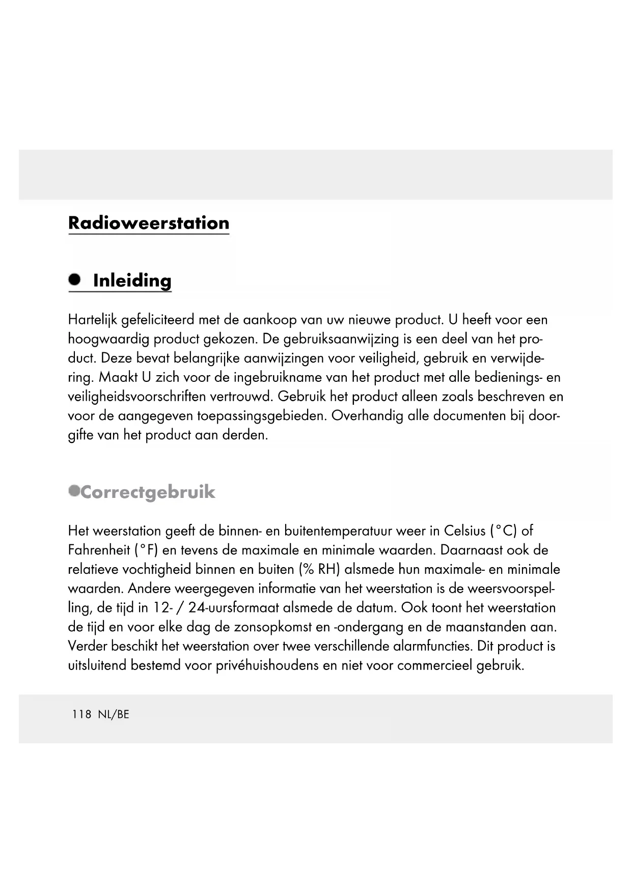 Tijdzone / Tijd / Datum / Taal handmatig instellen ............................... Pagina 130 Wektijd instellen ..................................................................................... Pagina 132 Wekfunctie activeren / deactiveren ...................................................... Pagina 133 Alarmsignaal uitschakelen ..................................................................... Pagina 134 SNOOZE-functie .................................................................................... Pagina 134 Weersverwachting in gebruik nemen ................................................... Pagina 134 Standplaats kiezen ................................................................................. Pagina 136 Standplaats handmatig kiezen .............................................................. Pagina 137 Maanfasen ............................................................................................. Pagina 141117 NL/BE Luchtdruk van de afgelopen 12 uur aflezen ........................................ Pagina 141 Instelling van de luchtdrukweergave .................................................... Pagina 142 Kanaal instellen ...................................................................................... Pagina 143 Temperatuur en temperatuurtrend weergeven ..................................... Pagina 144 Luchtvochtigheid en luchtvochtigheidstrend weergeven ...................... Pagina 144 Maximale / minimale temperatuur / luchtvochtigheid weergeven ...... Pagina 145 Temperatuur- en vorstalarm ................................................................... Pagina 146 Temperatuur- en vorstalarm activeren / deactiveren ............................ Pagina 146 Achtergrondverlichting ........................................................................... Pagina 147 Batterij-indicator ..................................................................................... Pagina 147 Batterijen vervangen .............................................................................. Pagina 147 Storingen verhelpen ................................................................. Pagina 148 Reiniging en onderhoud ........................................................ Pagina 149 Verwijdering ................................................................................... Pagina 150 Garantie .............................................................................................. Pagina 151 Informatie .......................................................................................... Pagina 152 Conformiteitsverklaring .......................................................................... Pagina 152118 NL/BE Radioweerstation Inleiding Hartelijk gefeliciteerd met de aankoop van uw nieuwe product. U heeft voor een hoogwaardig product gekozen. De gebruiksaanwijzing is een deel van het pro- duct. Deze bevat belangrijke aanwijzingen voor veiligheid, gebruik en verwijde- ring. Maakt U zich voor de ingebruikname van het product met alle bedienings- en veiligheidsvoorschriften vertrouwd. Gebruik het product alleen zoals beschreven en voor de aangegeven toepassingsgebieden. Overhandig alle documenten bij door- gifte van het product aan derden. Correct gebruik Het weerstation geeft de binnen- en buitentemperatuur weer in Celsius (°C) of Fahrenheit (°F) en tevens de maximale en minimale waarden. Daarnaast ook de relatieve vochtigheid binnen en buiten (% RH) alsmede hun maximale- en minimale waarden. Andere weergegeven informatie van het weerstation is de weersvoorspel- ling, de tijd in 12- / 24-uursformaat alsmede de datum. Ook toont het weerstation de tijd en voor elke dag de zonsopkomst en -ondergang en de maanstanden aan. Verder beschikt het weerstation over twee verschillende alarmfuncties. Dit product is uitsluitend bestemd voor privéhuishoudens en niet voor commercieel gebruik.119 NL/BE Onderdelenbeschrijving Weerstation:
