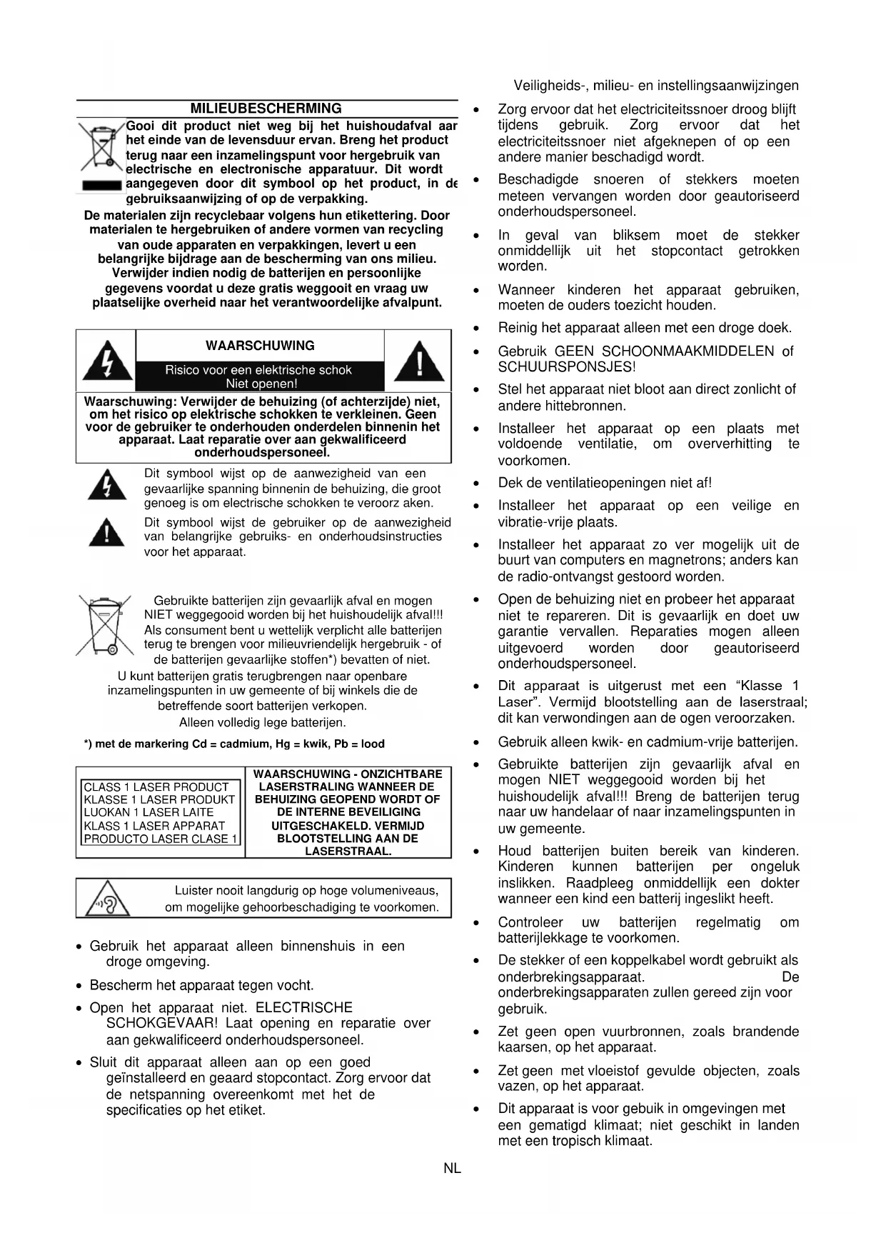 - Gebruikte batterijen zijn gevaarlijk afval en mogen NIET weggegooid worden bij het huishoudelijk afval!!! Breng de batterijen terug naar uw handelaar of naar inzamelingspunten in uw gemeente.