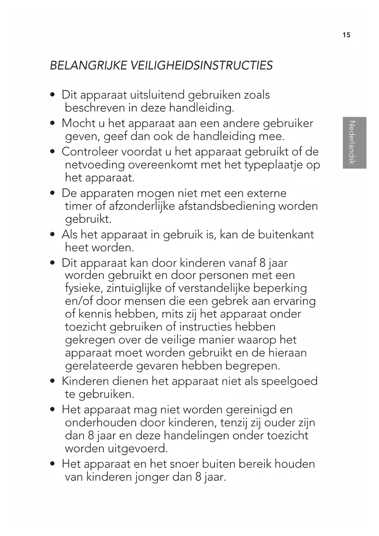 - Het apparaat en het snoer buiten bereik houden van kinderen jonger dan 8 jaar.Nederlandsk Nederlandsk