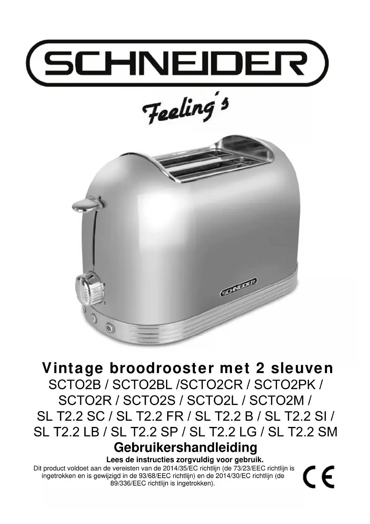 BELS/Benesov Telefon: 00420.317.725 060 E-mail: benezov@bels.cz © PKM GmbH & Co. KG, Neuer Wall 2, 47441 Moers , Germany Schneider Products SERVICE INFORMATIONIn Frankreich wird dieses Produkt importiert von: ADMEA - 12 rue Jules Ferry - 93110 Rosny Sous Bois In Deutschland wird dieses Produkt importiert von: PKM GmbH & Co. KG, Neuer Wall 2-6, 47441 MoersVintage broodrooster met 2 sleuven SCTO2B / SCTO2BL /SCTO2CR / SCTO2PK / SCTO2R / SCTO2S / SCTO2L / SCTO2M / SL T2.2 SC / SL T2.2 FR / SL T2.2 B / SL T2.2 SI / SL T2.2 LB / SL T2.2 SP / SL T2.2 LG / SL T2.2 SM Gebruikershandleiding Lees de instructies zorgvuldig voor gebruik. Dit product voldoet aan de vereisten van de 2014/35/EC richtlijn (de 73/23/EEC richtlijn is ingetrokken en is gewijzigd in de 93/68/EEC richtlijn) en de 2014/30/EC richtlijn (de 89/336/EEC richtlijn is ingetrokken).NL - 2 BELANGRIJKE VEILIGHEIDSVOORSCHRIFTEN Dompel het apparaat nooit onder in water. Als er water door de openingen binnenkomt, kan het water het apparaat beschadigen. Controleer of het brood goed in de sleuven past voor u het brood roostert. Brood dat niet heel is, of te dik kan het mechanisme beschadigen. Raak de metalen onderdelen niet aan wanneer het apparaat in gebruik is. Raak hete oppervlakken niet aan zonder handschoenen of bescherming. Laat het apparaat niet onbeheerd in werking, of binnen bereik van kinderen. Dit apparaat mag alleen worden gebruikt door volwassenen.NL - 3