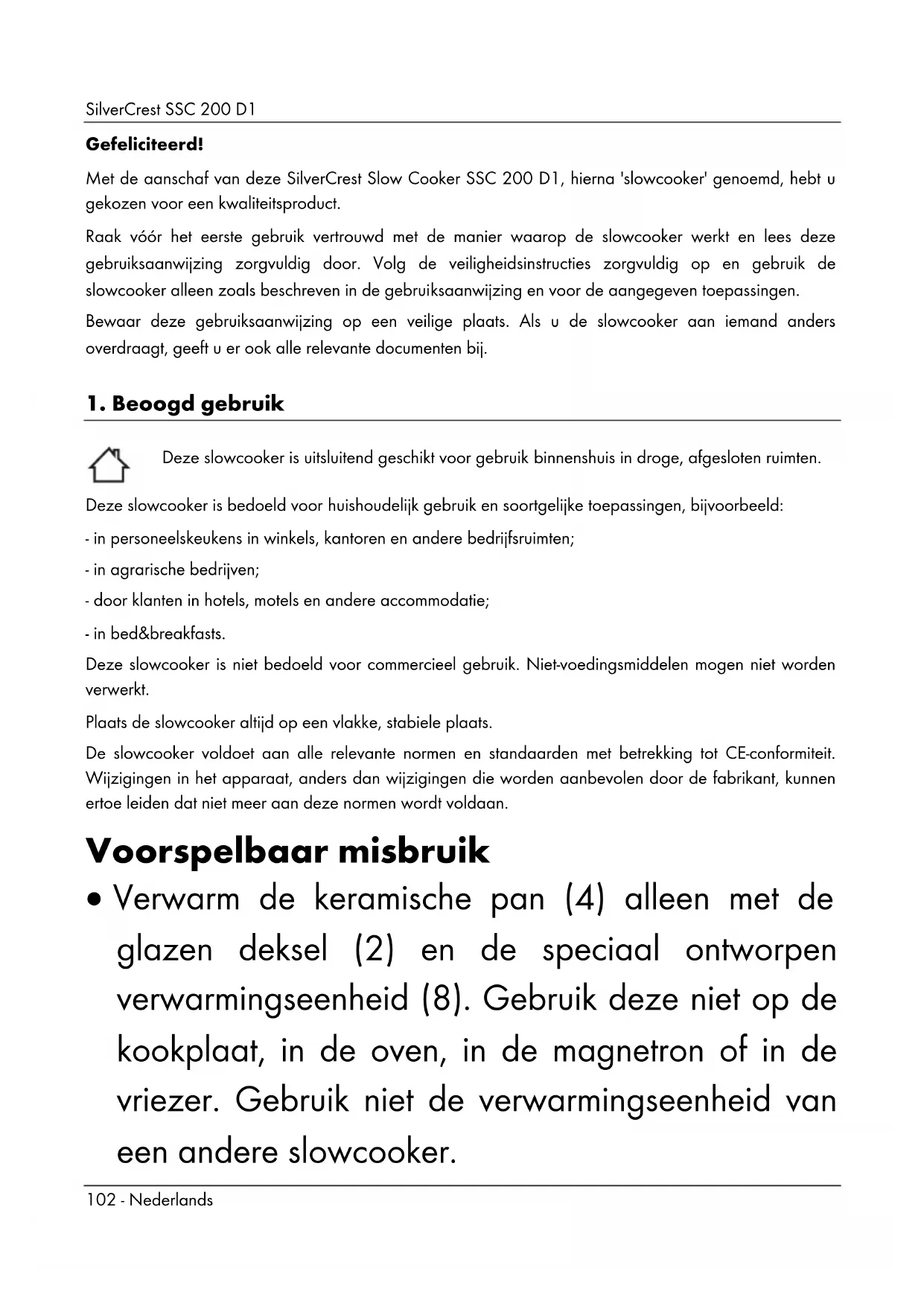 Deze slowcooker is uitsluitend geschikt voor gebruik binnenshuis in droge, afgesloten ruimten. Deze slowcooker is bedoeld voor huishoudelijk gebruik en soortgelijke toepassingen, bijvoorbeeld: - in personeelskeukens in winkels, kantoren en andere bedrijfsruimten; - in agrarische bedrijven; - door klanten in hotels, motels en andere accommodatie; - in bed&breakfasts. Deze slowcooker is niet bedoeld voor commercieel gebruik. Niet-voedingsmiddelen mogen niet worden verwerkt. Plaats de slowcooker altijd op een vlakke, stabiele plaats. De slowcooker voldoet aan alle relevante normen en standaarden met betrekking tot CE-conformiteit. Wijzigingen in het apparaat, anders dan wijzigingen die worden aanbevolen door de fabrikant, kunnen ertoe leiden dat niet meer aan deze normen wordt voldaan. Voorspelbaar misbruik Verwarm de keramische pan (4) alleen met de glazen deksel (2) en de speciaal ontworpen verwarmingseenheid (8). Gebruik deze niet op de kookplaat, in de oven, in de magnetron of in de vriezer. Gebruik niet de verwarmingseenheid van een andere slowcooker.SilverCrest SSC 200 D1 Nederlands - 103 Het is niet de bedoeling dat de slowcooker wordt gebruikt met een externe timer of een apart afstandsbedieningssysteem.